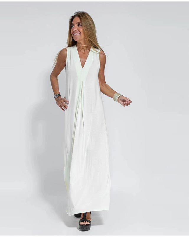 Dieses ärmellose Maxikleid mit V-Ausschnitt hat eine fließende Silhouette, die sich bei jedem Schritt schön bewegt. Es ist vielseitig einsetzbar und eignet sich für Freizeitausflüge, Strandtage oder besondere Anlässe. Der leichte Stoff und der zeitlose Schnitt machen es zu einem unverzichtbaren Kleidungsstück für das warme Wetter.