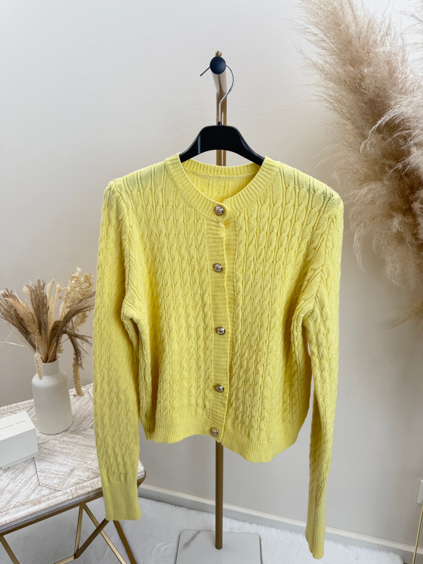 - Elegante Goldknöpfe: Die goldfarbenen Knöpfe sind sorgfältig angebracht und verleihen dem Cardigan einen dezenten Glamour-Faktor, der jedes Outfit veredelt.