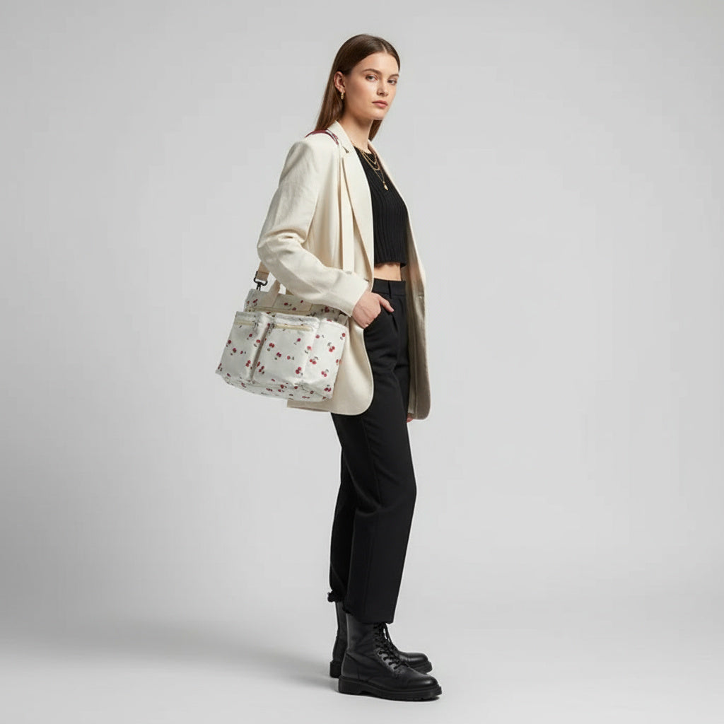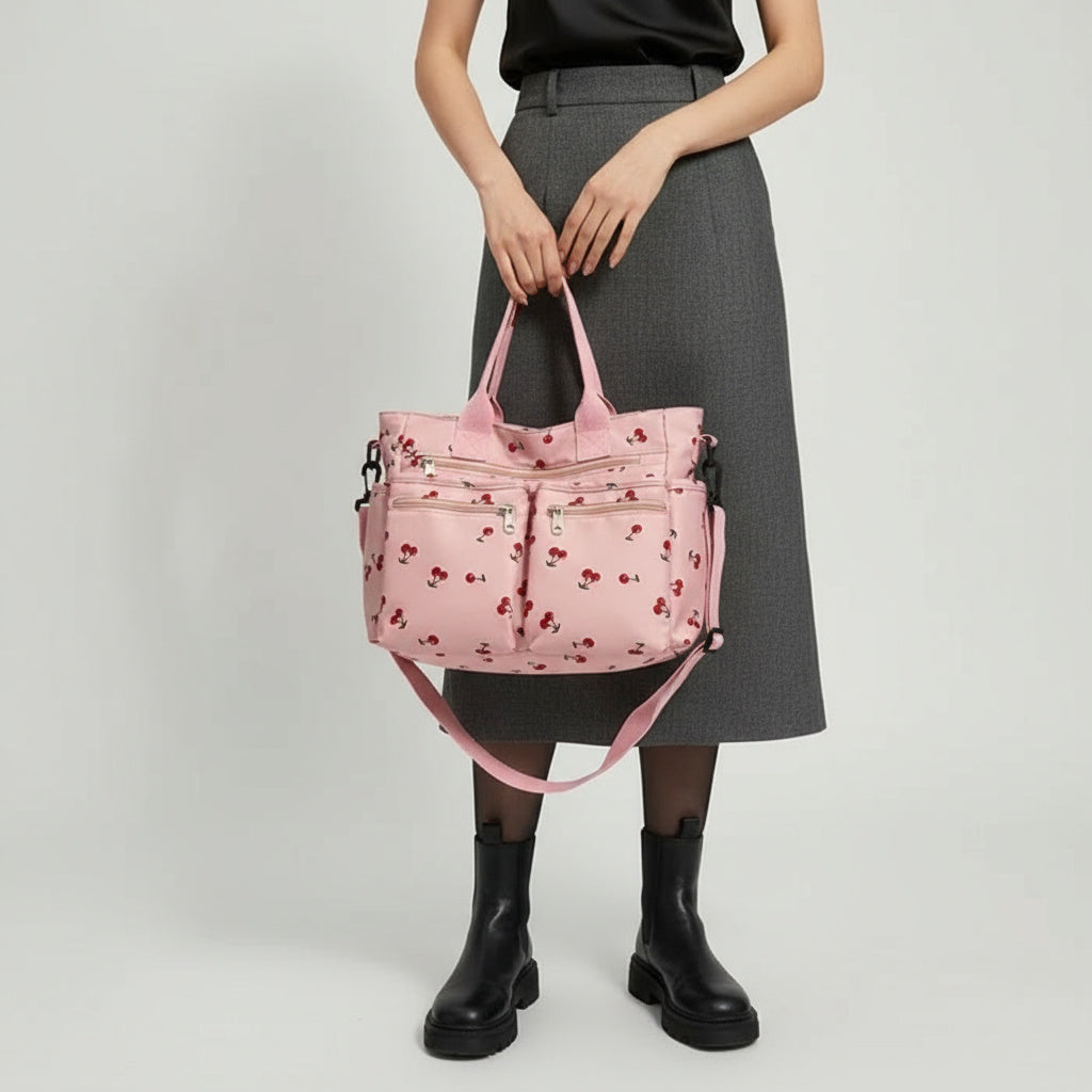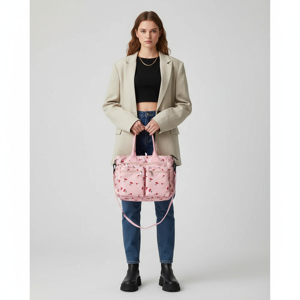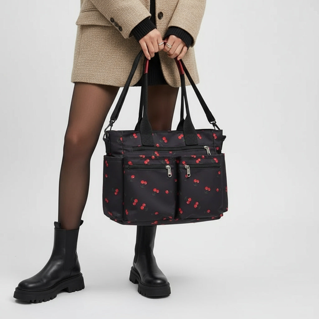 Aus canvas mit Kirschmuster gefertigt, ist diese leichte, aber geräumige Tasche ideal für all deine Essentials. Das gefütterte Innere bietet praktische Fächer für Handy, Schlüssel und mehr, plus drei zusätzliche Reißverschlusstaschen vorne. Mit stabilen Henkeln und einem verstellbaren Schultergurt – perfekt für Arbeit, Reisen oder den Alltag.