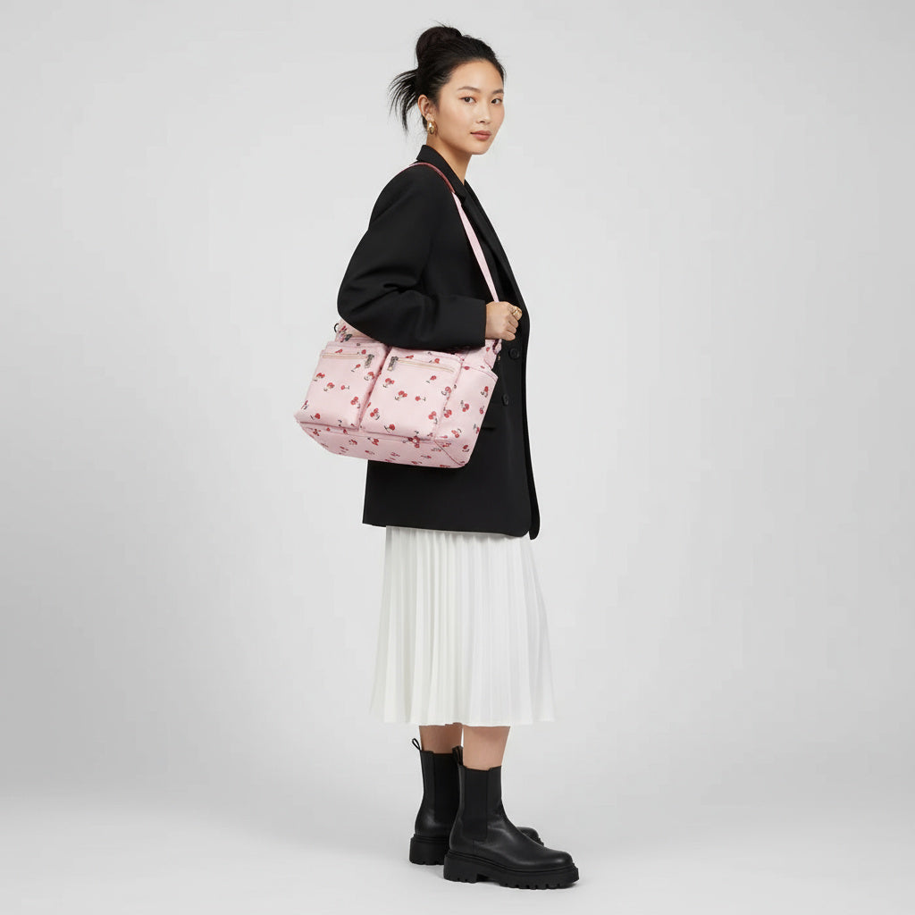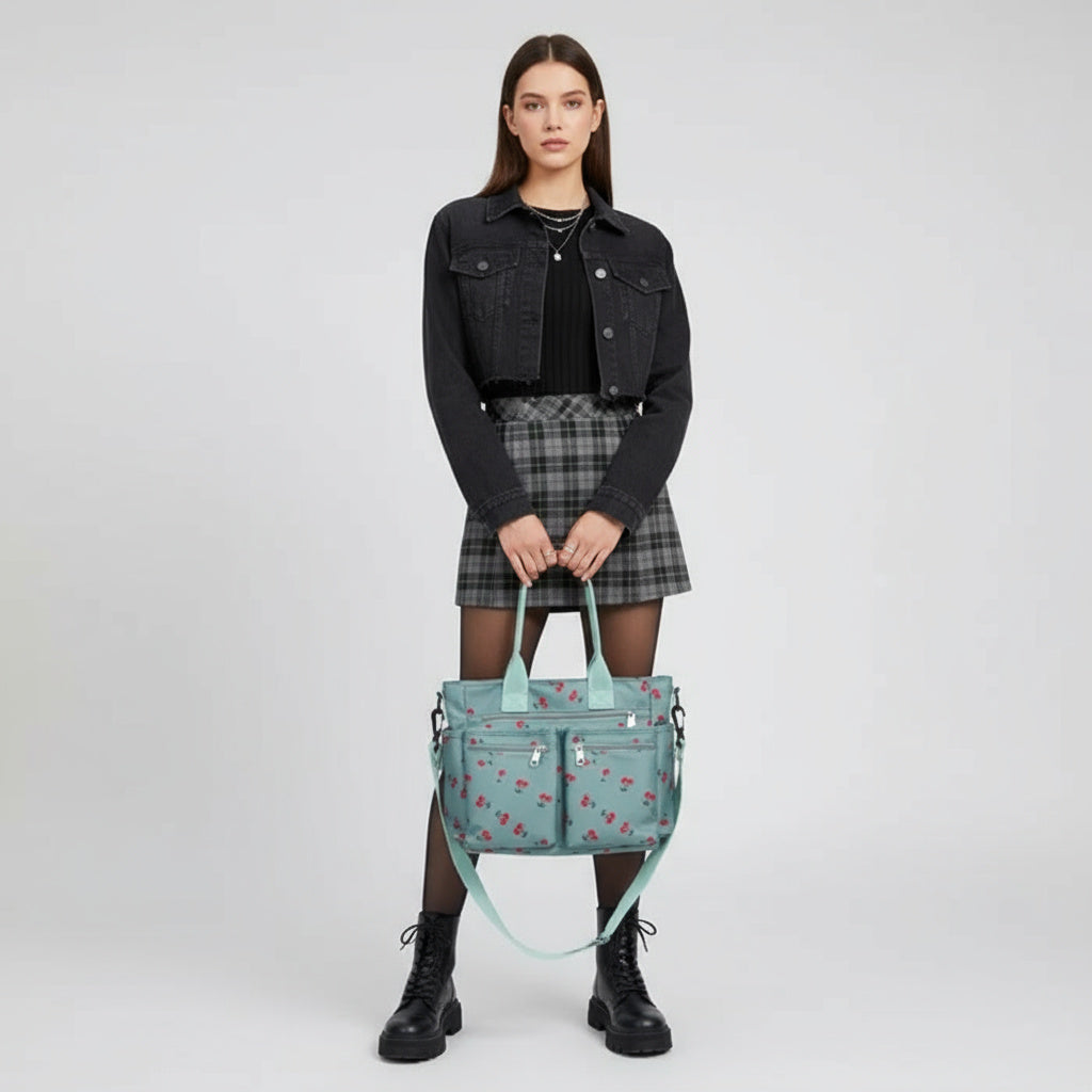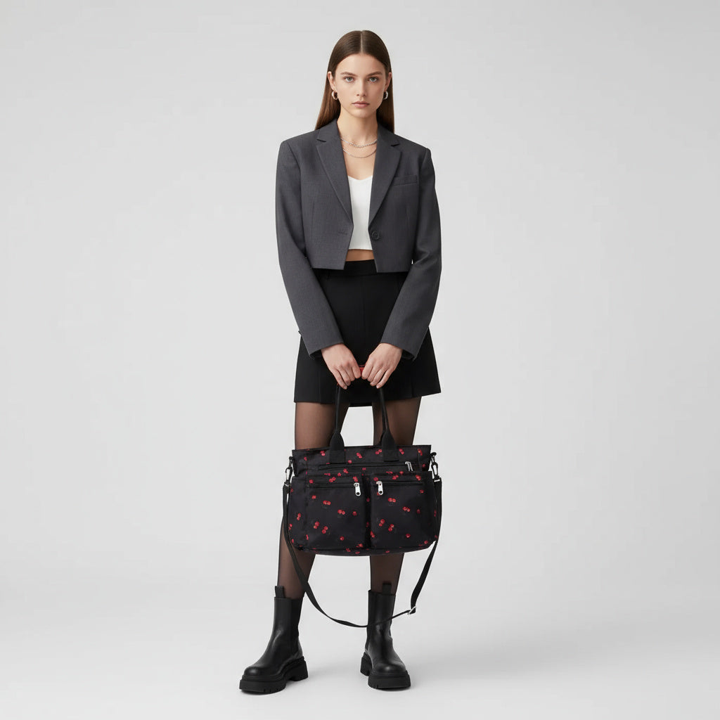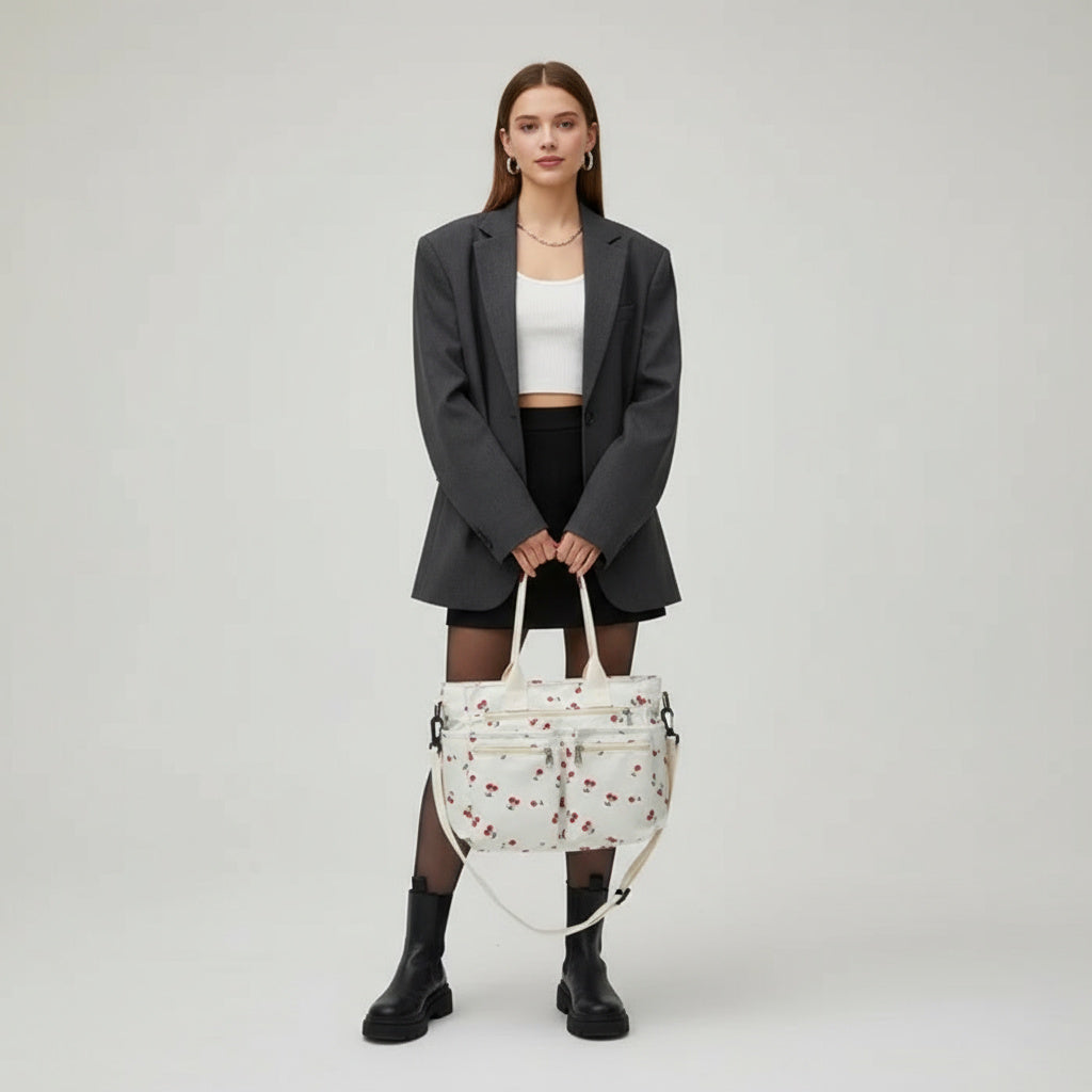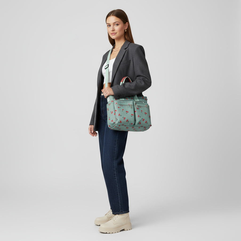 Aus canvas mit Kirschmuster gefertigt, ist diese leichte, aber geräumige Tasche ideal für all deine Essentials. Das gefütterte Innere bietet praktische Fächer für Handy, Schlüssel und mehr, plus drei zusätzliche Reißverschlusstaschen vorne. Mit stabilen Henkeln und einem verstellbaren Schultergurt – perfekt für Arbeit, Reisen oder den Alltag.