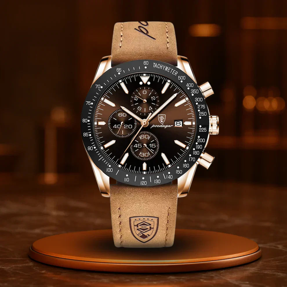 Das präzise Quarzwerk ist mehr als Technik. Es ist Vertrauen in jede Sekunde. Die leuchtenden Zeiger? Ein Zeichen von Menschen, die im Dunkeln führen. Der Chronograph? Für diejenigen, die lieber handeln als warten.