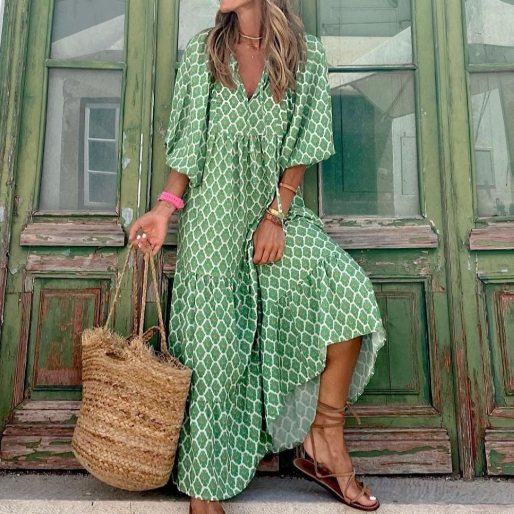 Dieses lange Maxikleid für Damen kombiniert stilvolle Eleganz mit einem luftigen Design. Mit einem V-Ausschnitt und Halbärmeln eignet es sich hervorragend für verschiedene Anlässe, sei es beim Stadtbummel oder an einem entspannten Tag im Freien. Die fließende Silhouette sorgt dafür, dass Sie mühelos schick gekleidet sind und dabei bequem bleiben.