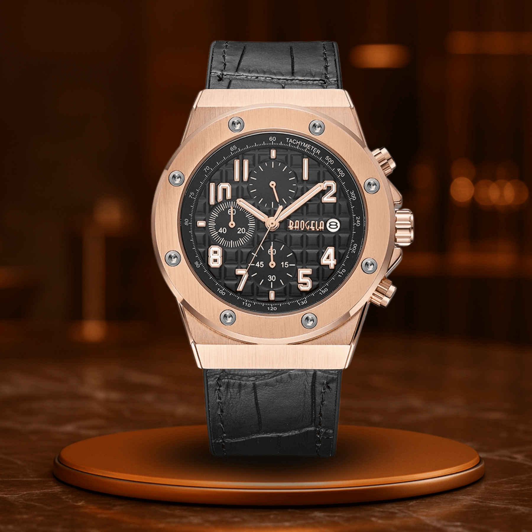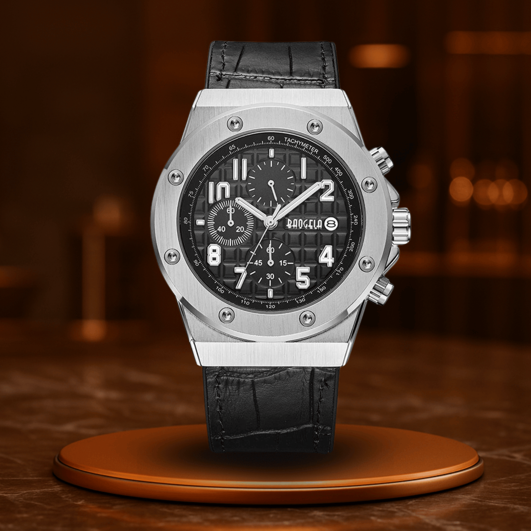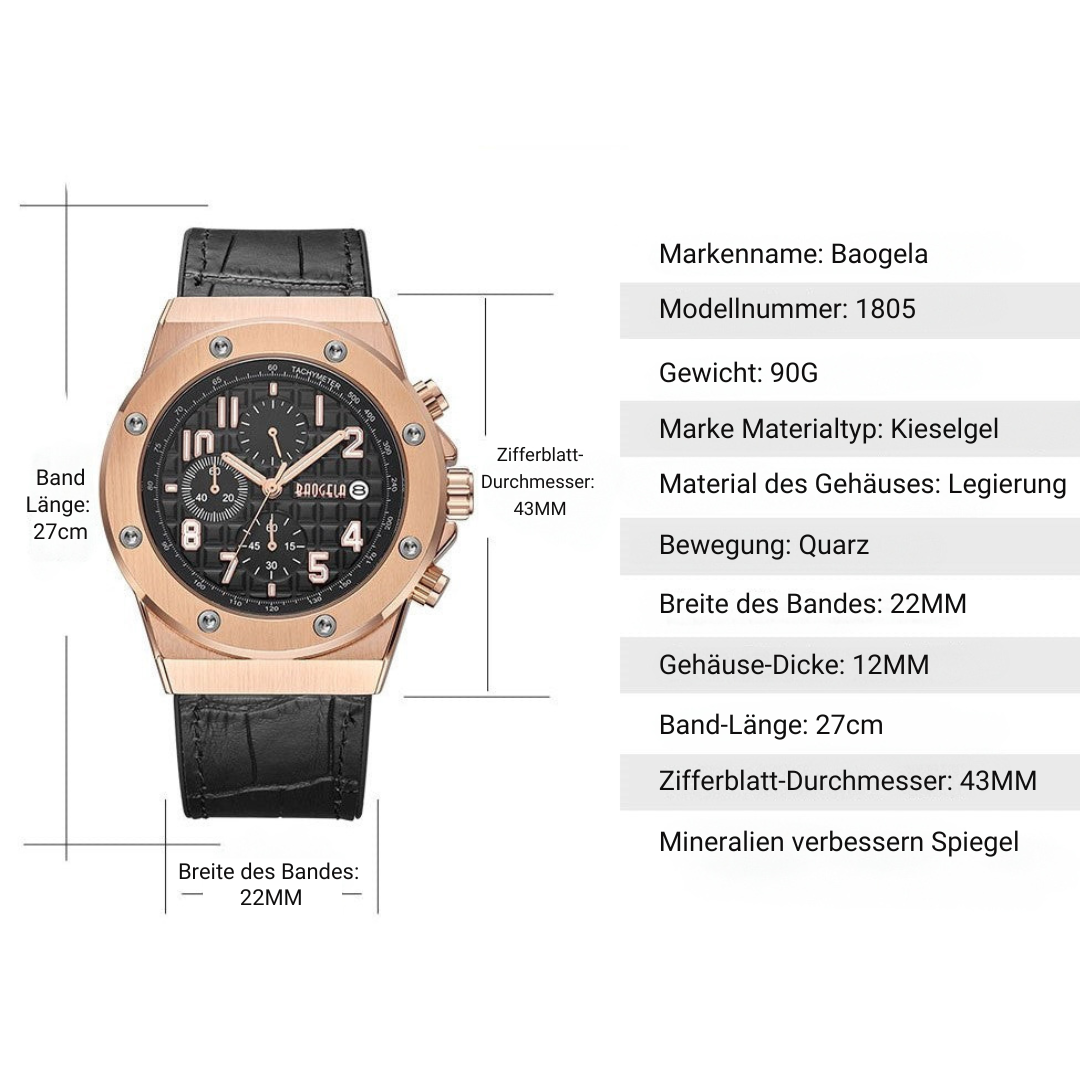 Das echte Lederarmband sorgt für ein komfortables Trageerlebnis und gleichzeitig für eine selbstbewusste Ausstrahlung. Leuchtende Zeiger, Chronographenfunktion und ein zuverlässiges Quarzwerk vervollständigen das technische Innenleben – bereit, jedes Ziel mit Stil zu erreichen.