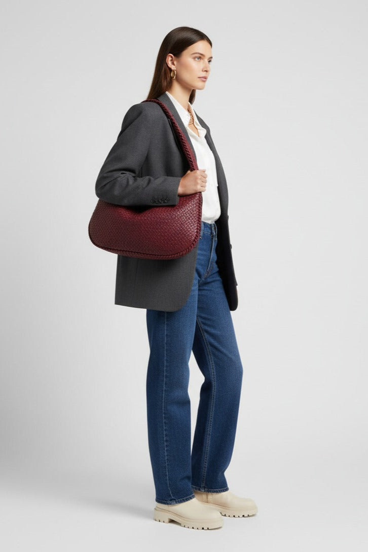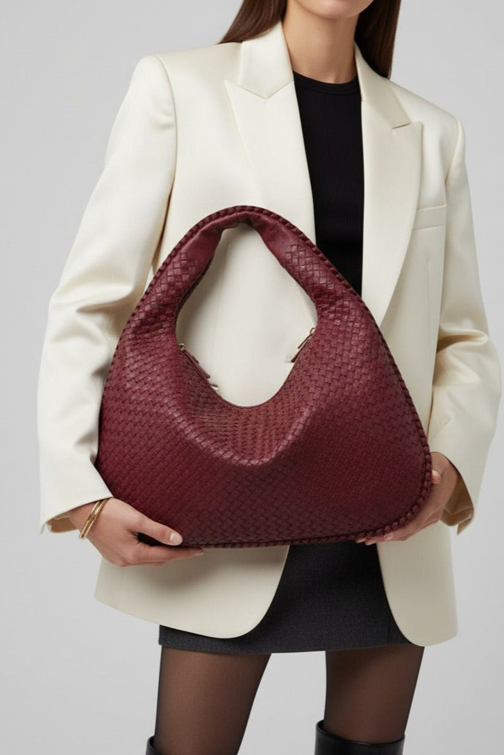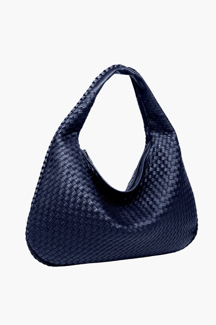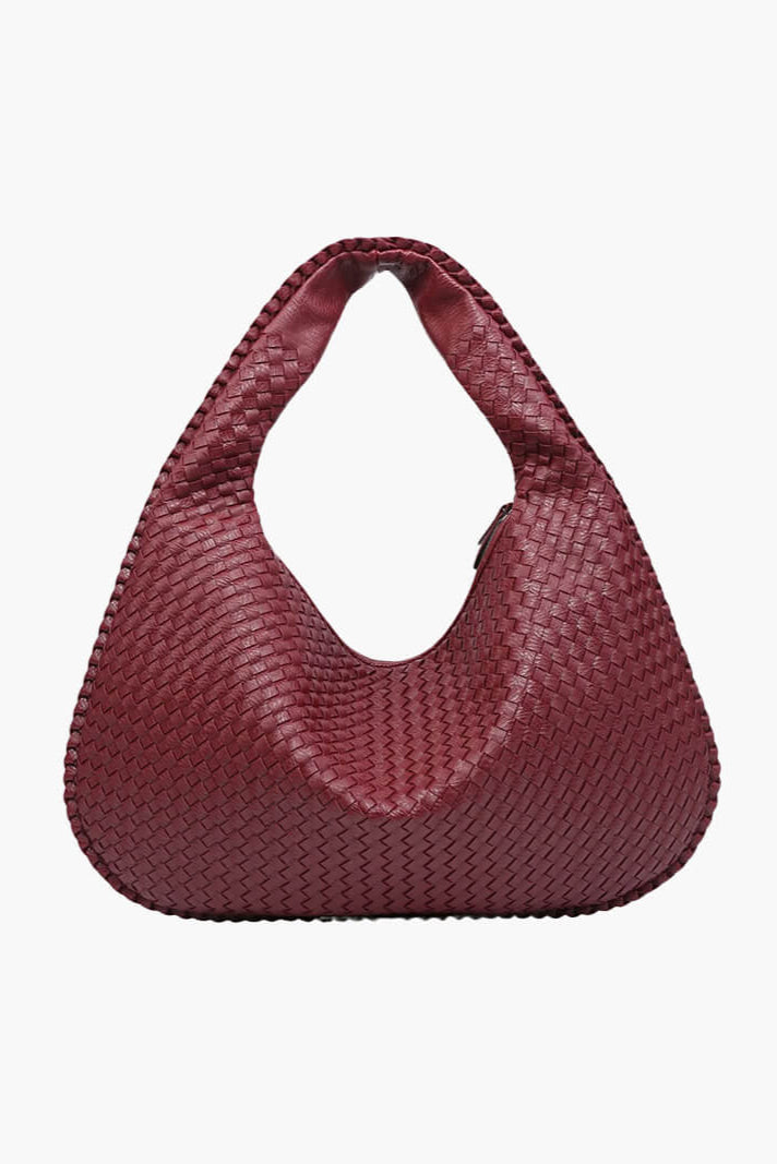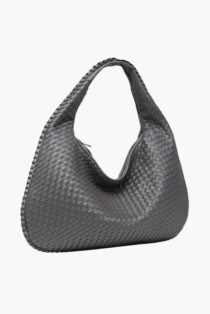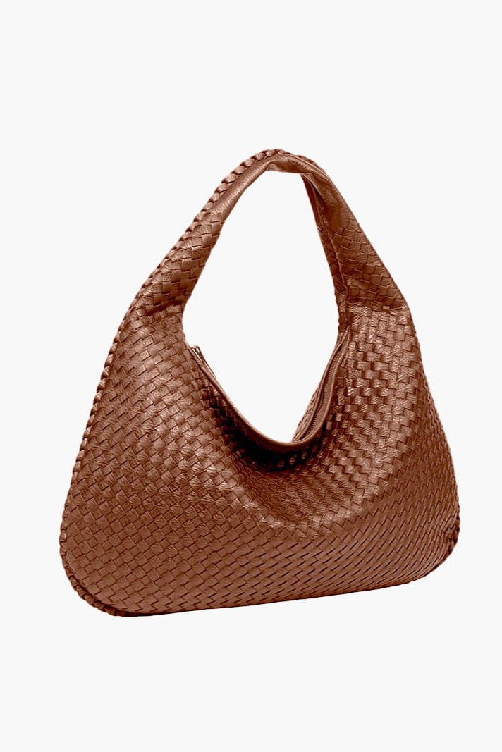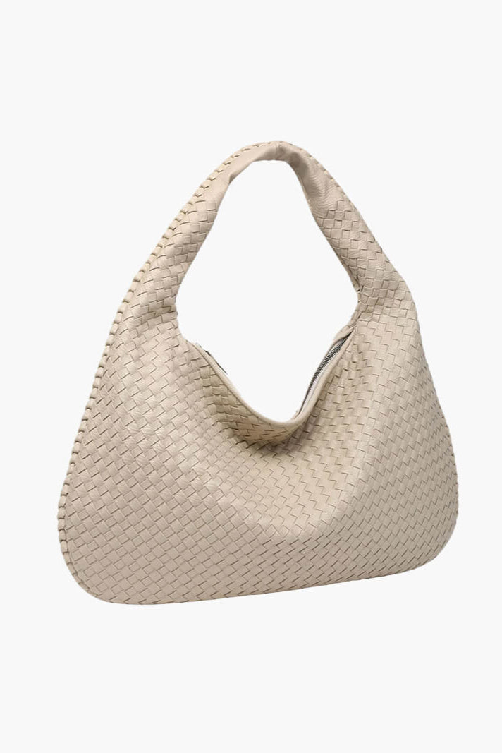 ESMAY hat eine runde Form und ein elegantes, geflochtenes Design. Die Tasche verfügt über ein großes Hauptfach mit Reißverschluss, zwei kleinere Innentaschen mit Reißverschluss und eine kleine offene Tasche. Diese vielseitige Tasche bietet viel Platz für alle Ihre Essentials.