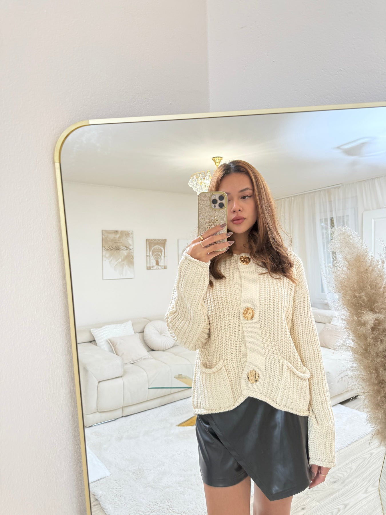 - Schonendes Bügeln: Falls nötig, bügle den Cardigan auf links bei niedriger Temperatur, um die goldenen Details und den Strick zu schonen.
