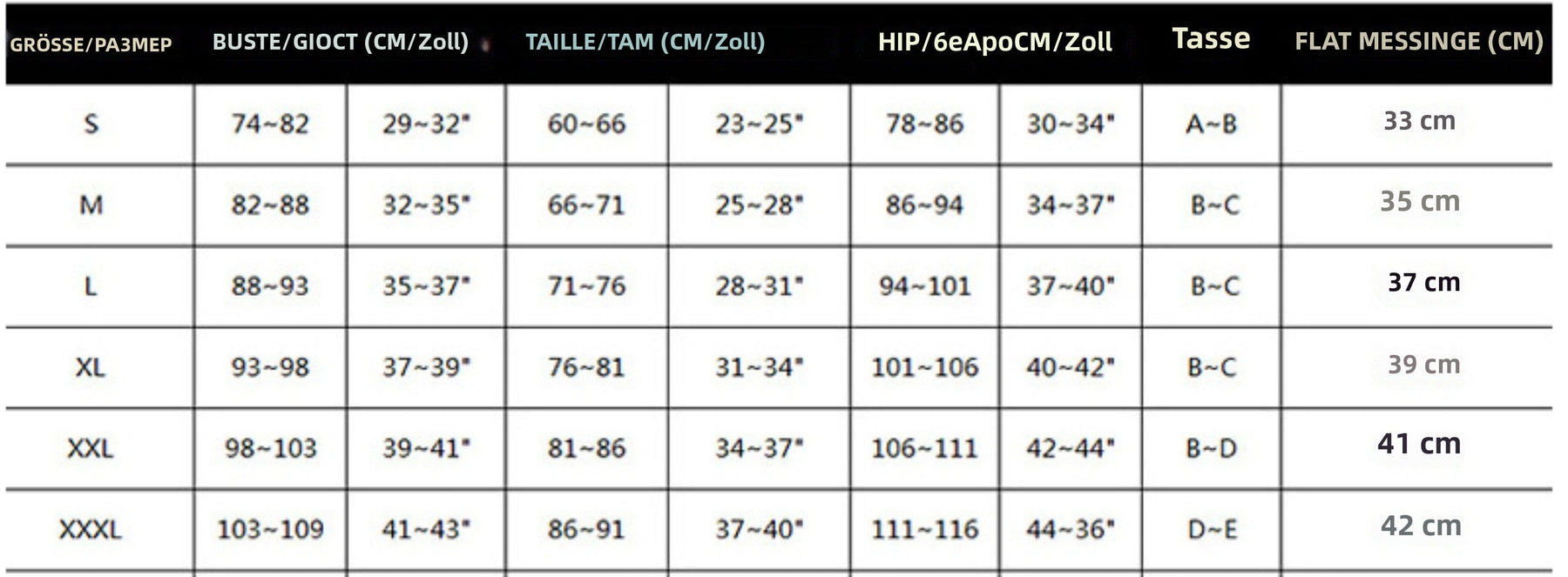 | Größe | Brust (cm) | Taille (cm) | Hüfte (cm) |