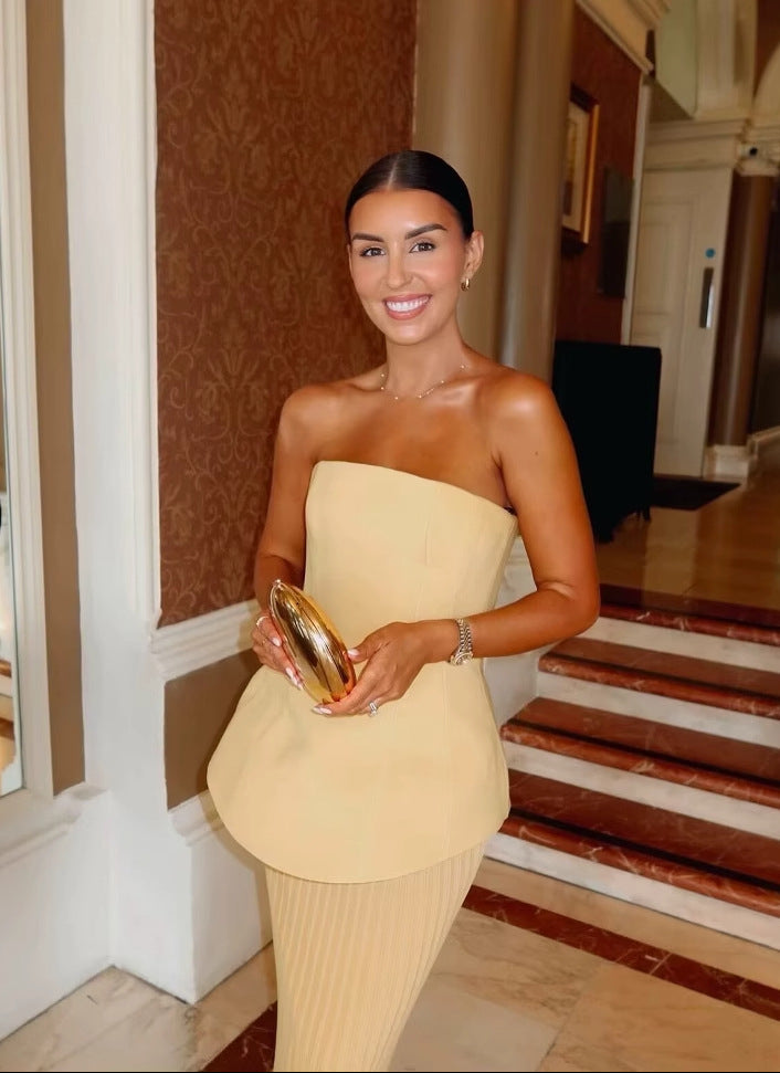 Ina ist ein echter blickfang für stilbewusste frauen, die elegante silhouette mit modernen details verbinden möchten. das trägerlose oberteil formt ein schönes dekolleté, während der plissierte rock und das peplum-detail einen femininen und selbstbewussten auftritt garantieren. ideal für hochzeiten, empfänge oder formelle events – dieses kleid bringt minimalistische eleganz auf den punkt.