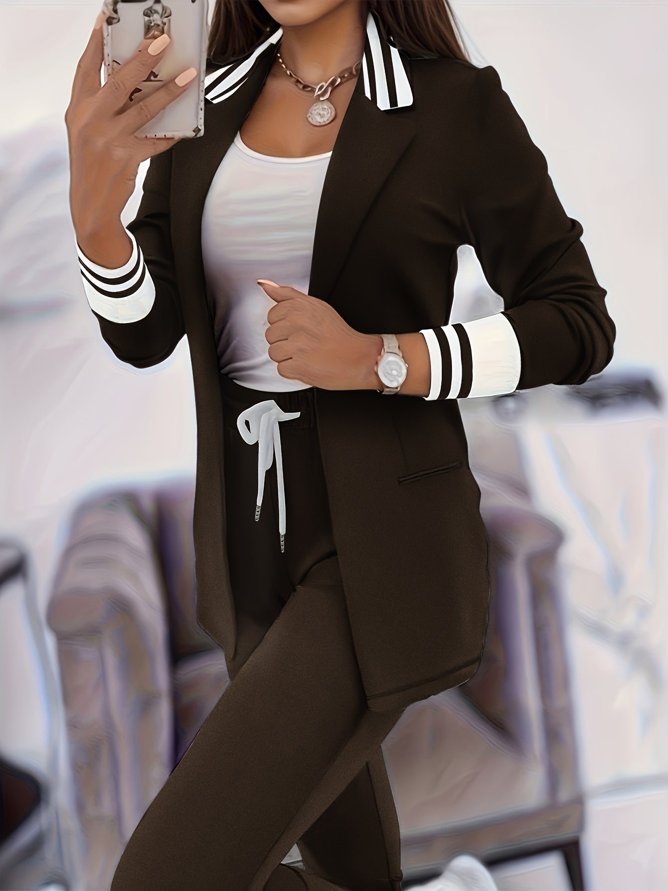 ✅Sportlich-schickes Entwurf: Kombiniert die Schärfe eines taillierten Blazers mit der Lässigkeit einer Jogginghose. Der gestreifte Kragen und die Ärmelbündchen sorgen für einen modernen, sportlichen Twist, der mühelos auffällt. Perfekt, wenn Sie gepflegt schauen und sich gleichzeitig wohlfühlen möchten. Ein Stil, der sowohl im Sitzungssaal als auch beim Brunch gut ankommt.