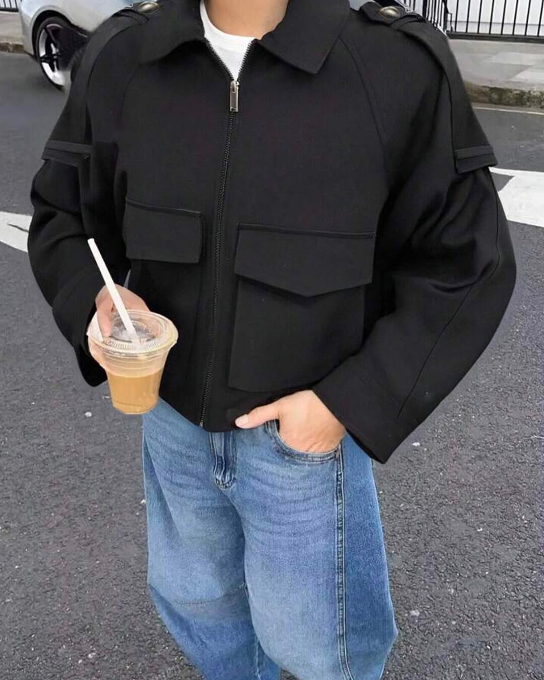 Diese kurz geschnittene trenchjacke vereint funktionalität mit einem modernen, minimalistische look. mit ihrem klaren schnitt, den großen aufgesetzten taschen und dem klassischen kragen ist sie das ideale statement-piece für jeden tag. die leichte, atmungsaktive stoffqualität sorgt für angenehmen tragekomfort und macht sie perfekt für unterwegs – ob beim bummeln durch die stadt oder auf dem weg ins büro.