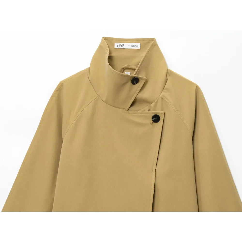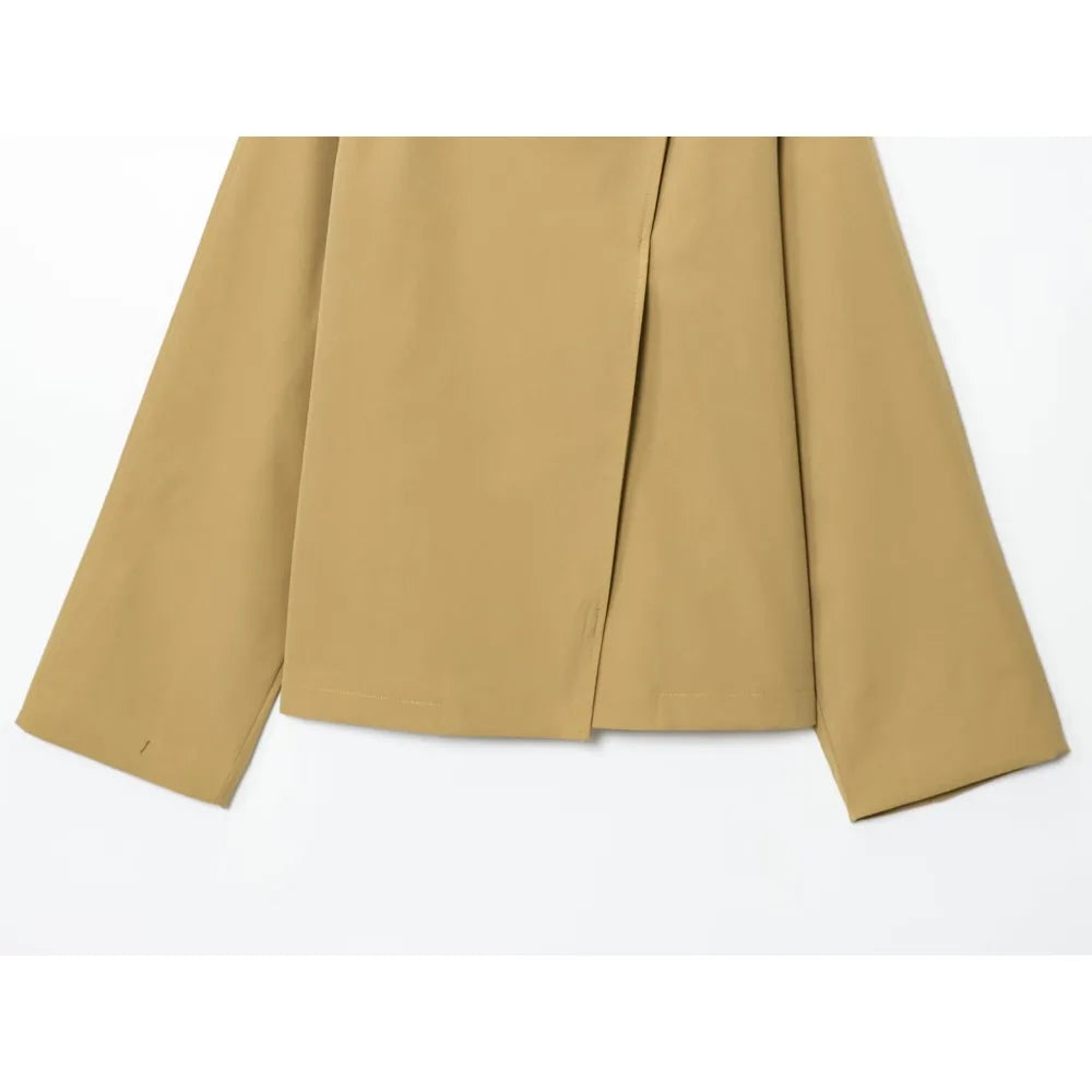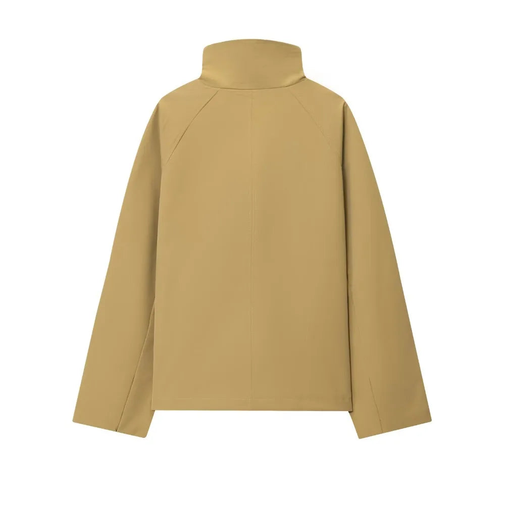 Diese kurze mantel verbindet minimalistisches design mit moderner lässigkeit. der hohe stehkragen und die saubere front sorgen für einen klaren, eleganten look. die lockere passform lässt sich leicht layern und passt zu denim, tailoring und city-outfits. ideale wahl für „stehhkragen mantel damen“, „oversize mantel“ und „minimal chic“.