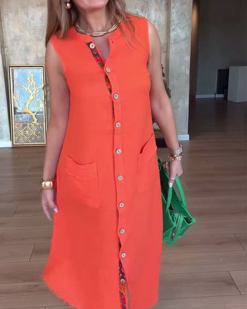 Kleid Knopfbesetzt Plissiert Ärmellos