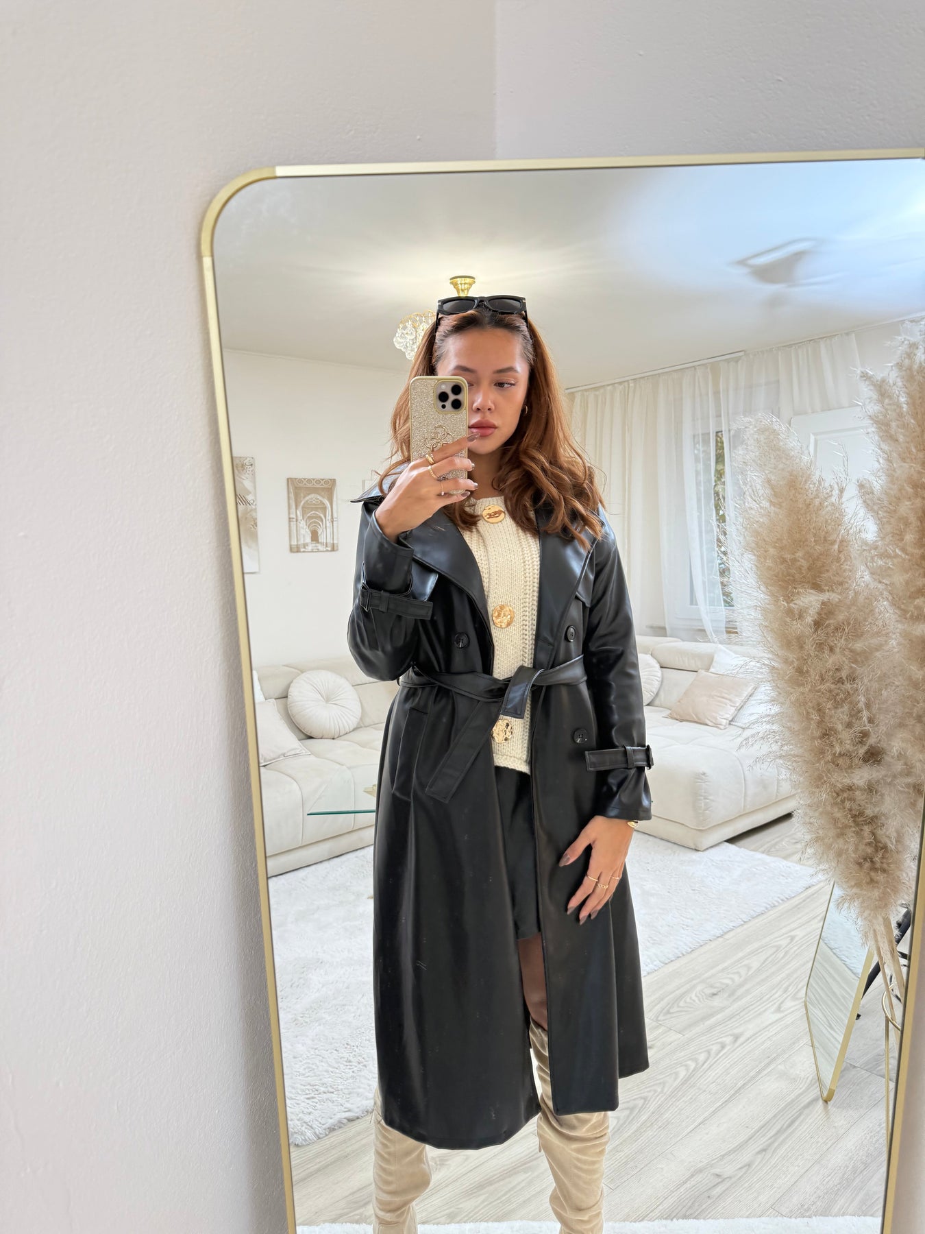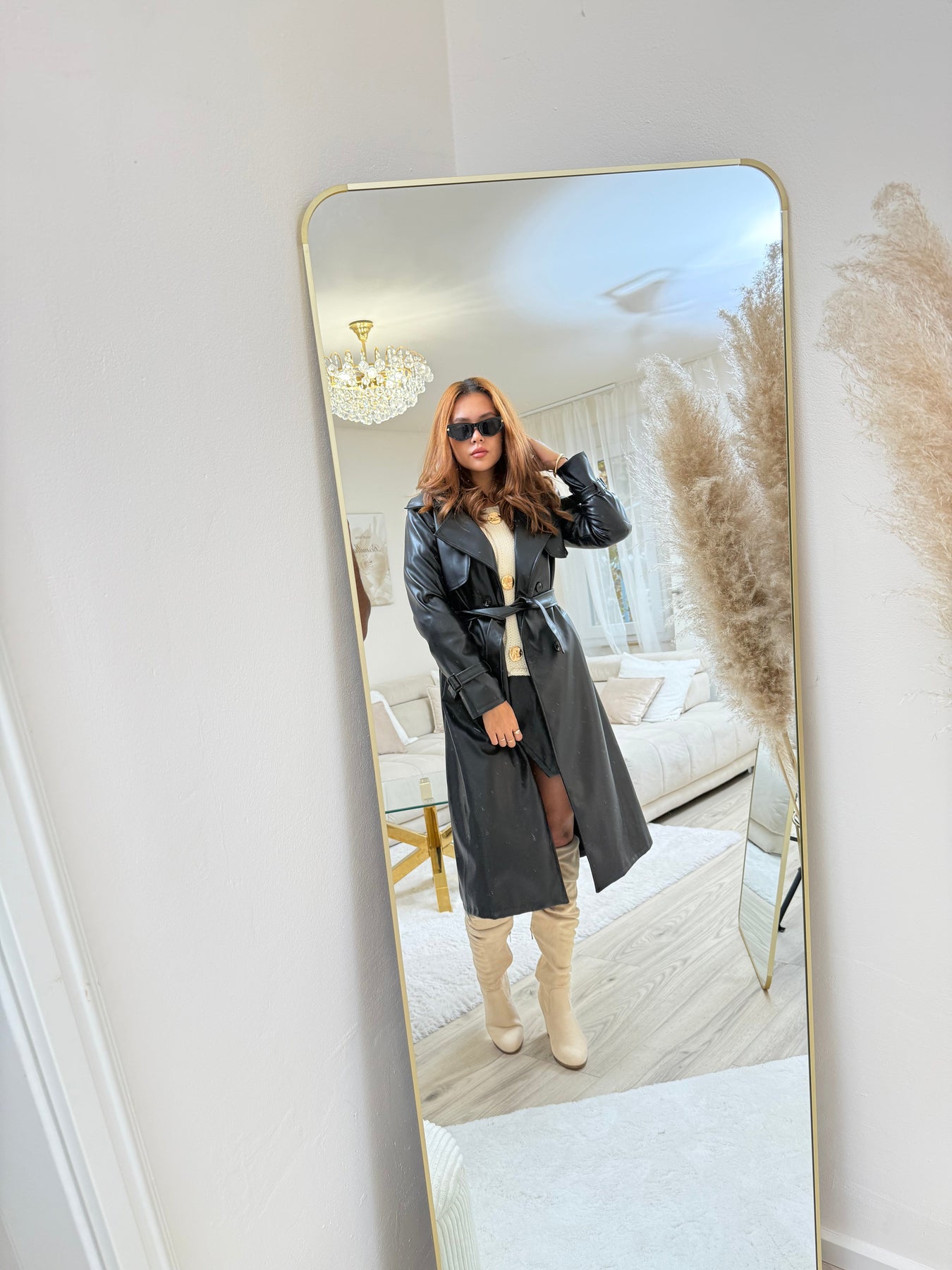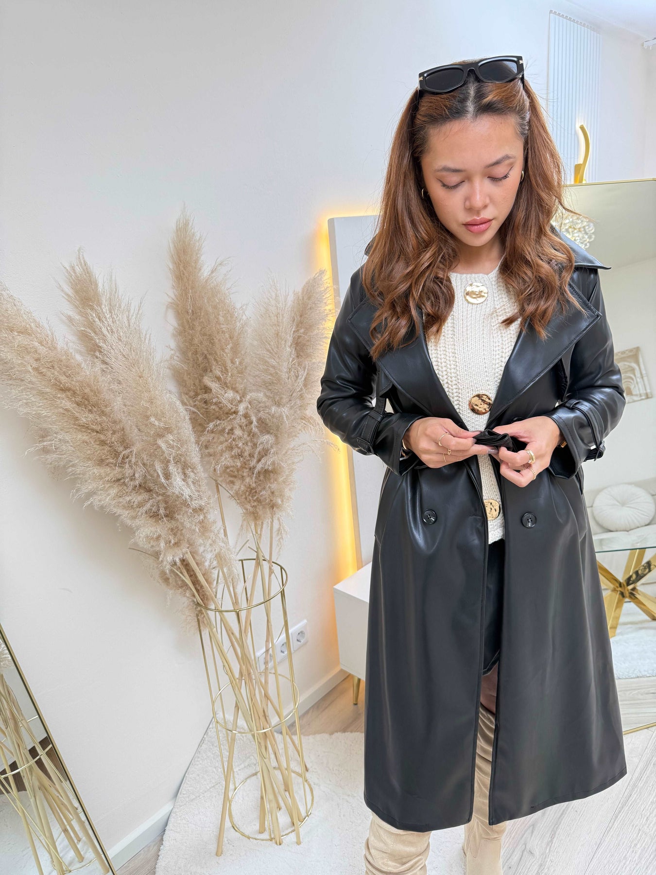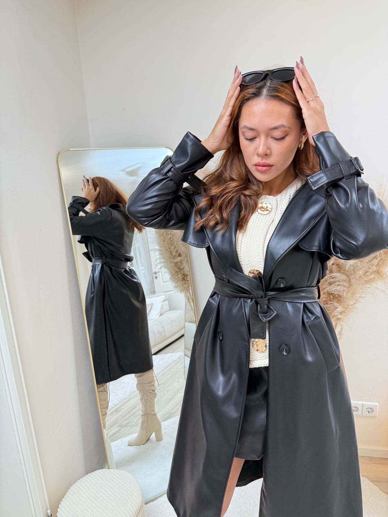 • Oberteil: Trage den Leder-Mantel über einem schlichten Rollkragenpullover oder einer eleganten Bluse.