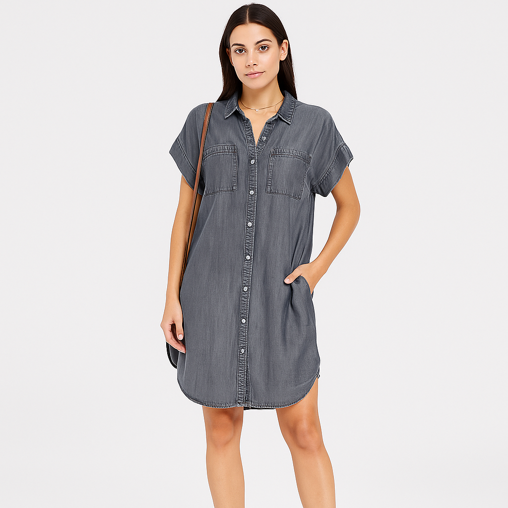 Mit durchdachten Seitentaschen für praktische Funktionalität, ohne auf Stil zu verzichten. Die taillierte, leicht geschwungene Passform betont Ihre Silhouette und bietet gleichzeitig Bewegungsfreiheit. Das schlichte Design und der weiche Denim machen dieses Kleid zum zuverlässigen Favoriten – vielseitig genug für den Lagenlook oder solo bei wärmerem Wetter.