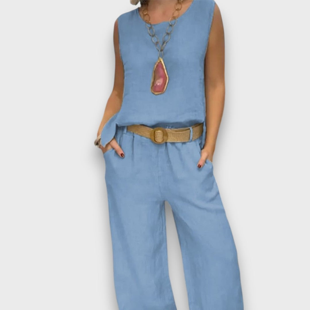 Marise bringt eine neue Leichtigkeit in deine Garderobe – mit klarer Linie, natürlichem Fall und einer Prise Understatement. Der ärmellose Top und die locker geschnittene Hose verschmelzen zu einem Ensemble, das sowohl pur als auch in Kombination mit Accessoires stilvoll wirkt. Perfekt für sonnige Städte, kreative Pausen und entspannte Momente mit Klasse.