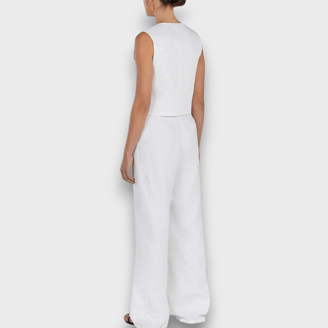 Solenne vereint die rohe Eleganz von Leinen mit einer raffinierten, sommerlichen Form. Die ärmellose Weste und die High-Waist-Hose mit weitem Bein schaffen eine Silhouette, die zugleich entspannt und stilvoll wirkt. Der tiefe Ausschnitt bringt Leichtigkeit ins Spiel, während jeder Schritt in diesem Look wie fließende Bewegung erscheint – natürlich, kraftvoll, mühelos.