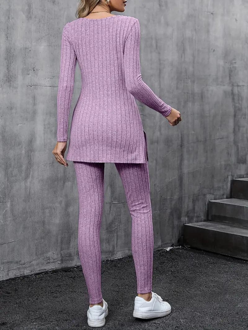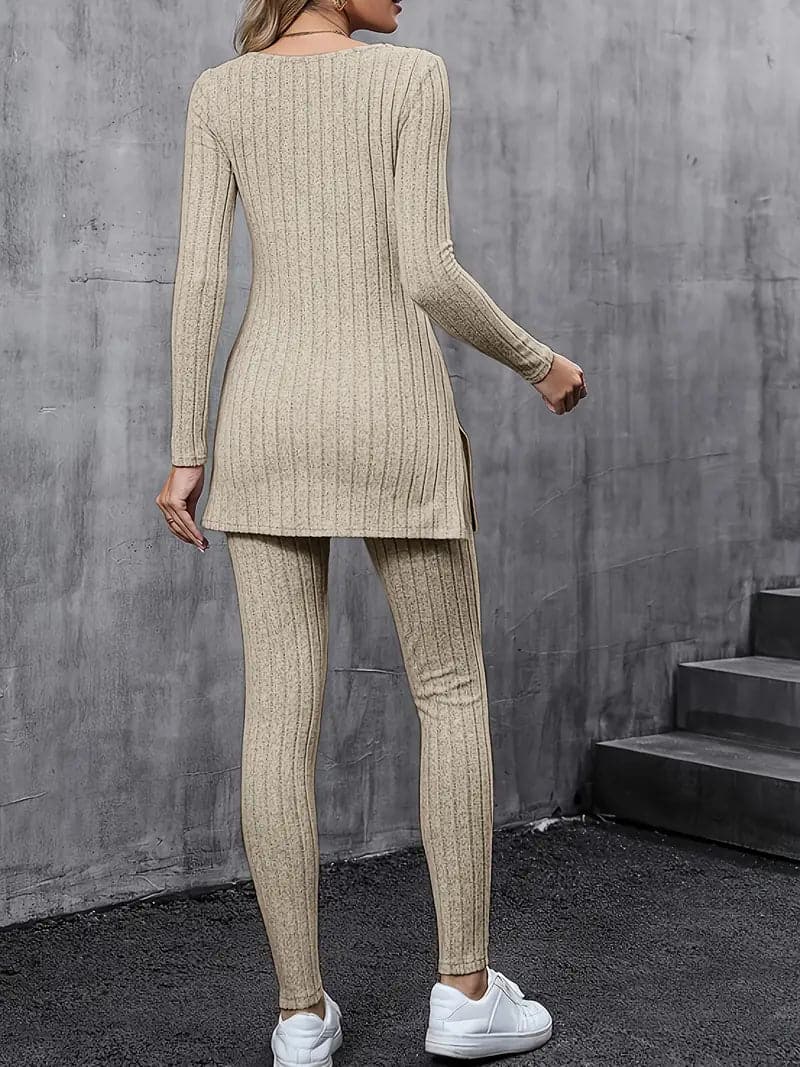 Sie können selbstbewusst aussehen in unserem Stilvolles Set für Damen besteht aus einem langärmeligen Oberteil und passenden Leggings. Das Ensemble besticht durch einen figurbetonten Schnitt und ein nahtloses Design, das eine schlanke Silhouette hervorhebt. Der bequeme und zugleich schicke Look macht es perfekt für entspannte Tage zu Hause oder lässige Ausflüge.