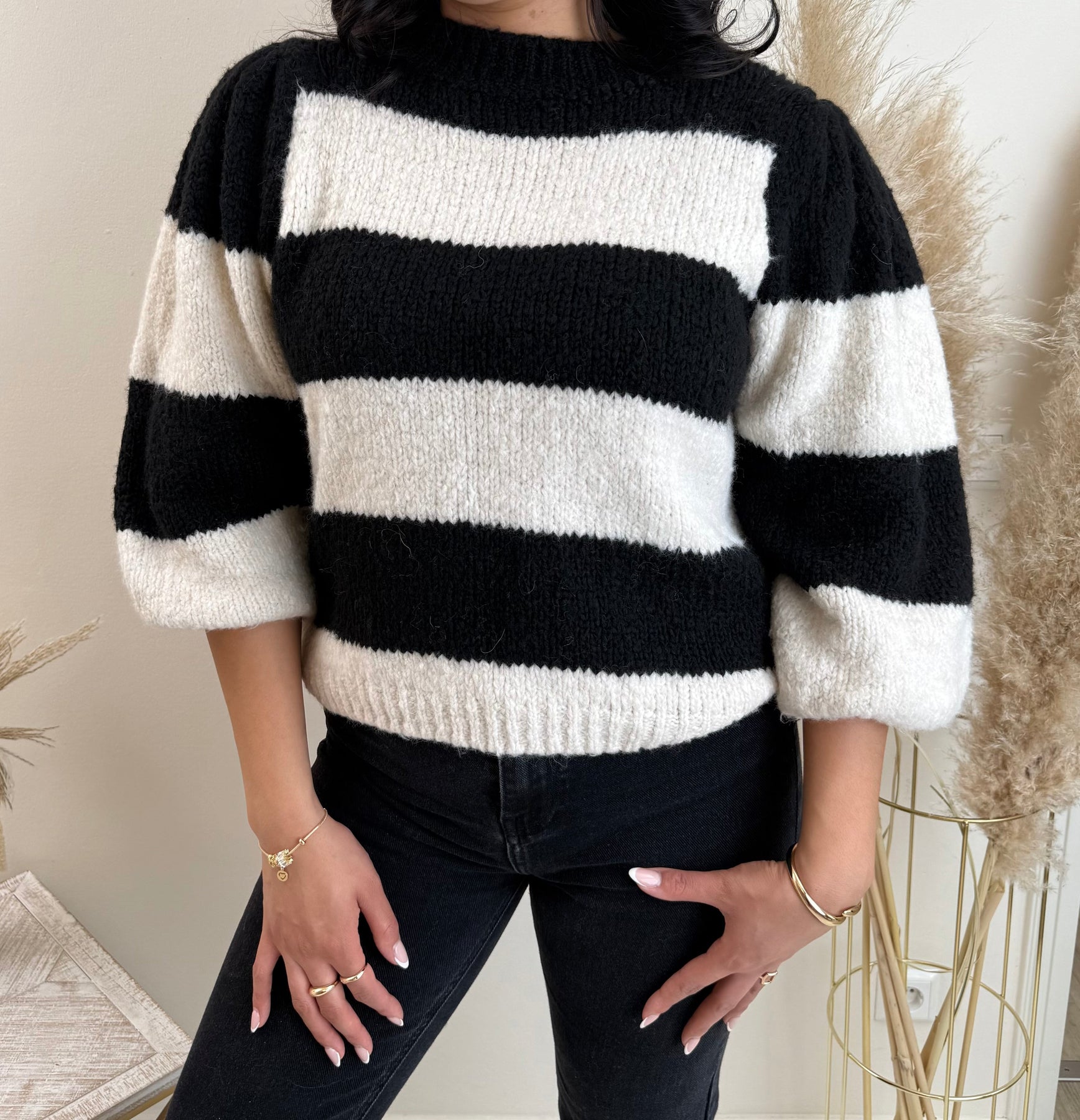 - Modischer Cosy-Look: Das markante Streifenmuster und die auffälligen Ballonärmel verleihen dem Pullover einen modernen, trendigen Look, der sowohl im Alltag als auch bei besonderen Anlässen für Aufsehen sorgt.