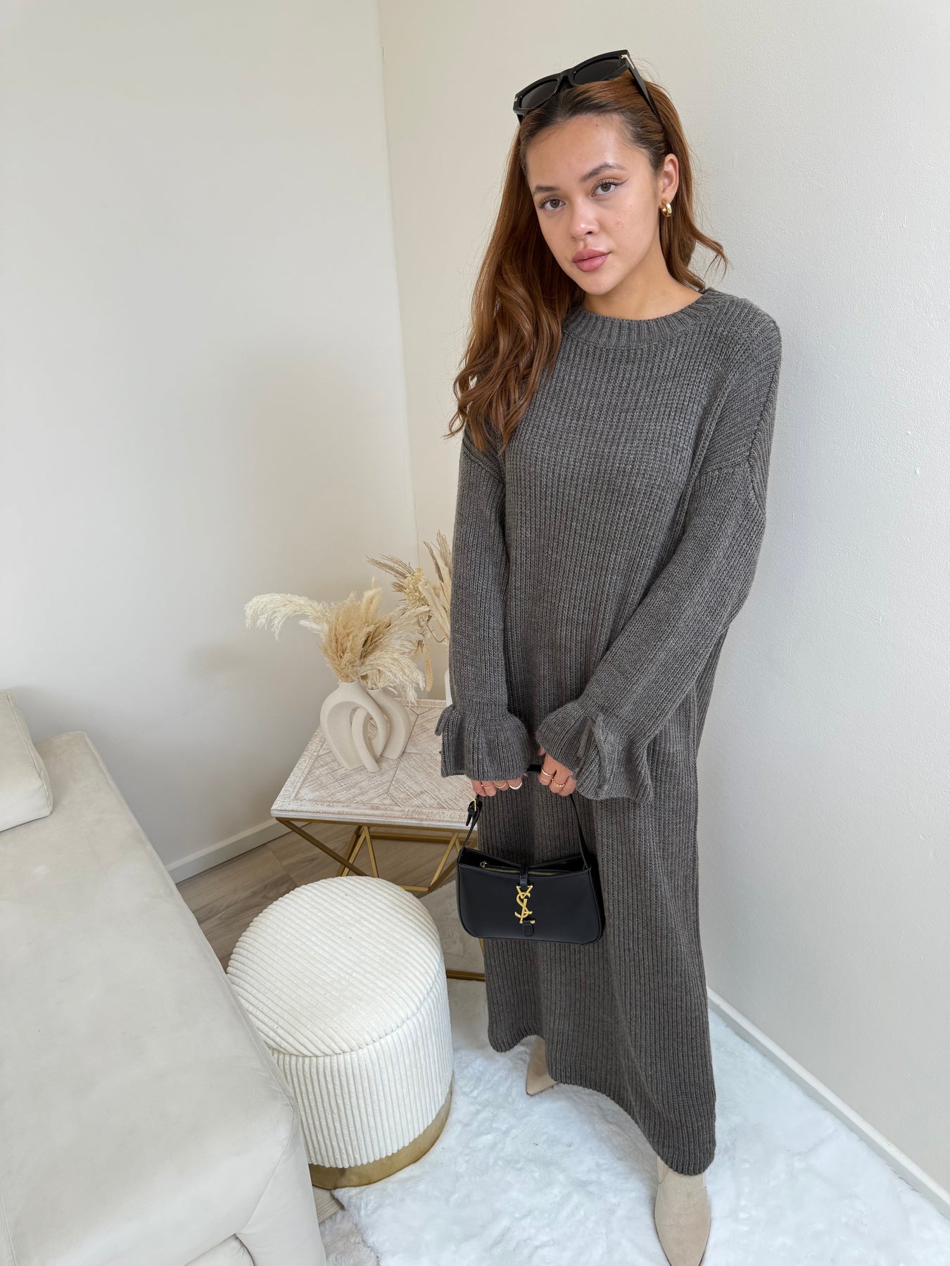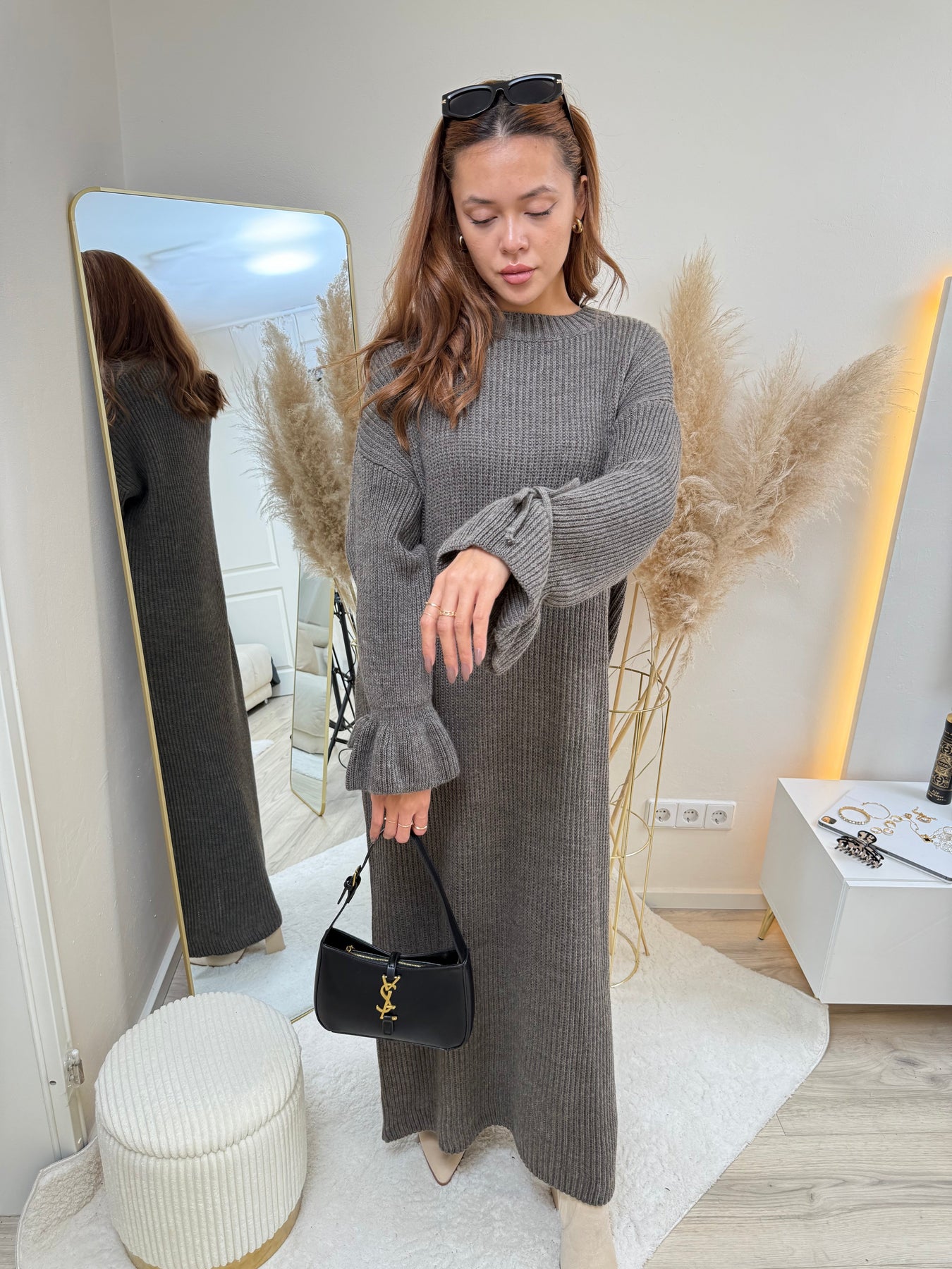 • Farben: Neutrale Töne wie Grau, Schwarz oder Beige harmonieren wunderbar mit dem weichen Grobstrick und lassen das Kleid zeitlos wirken.