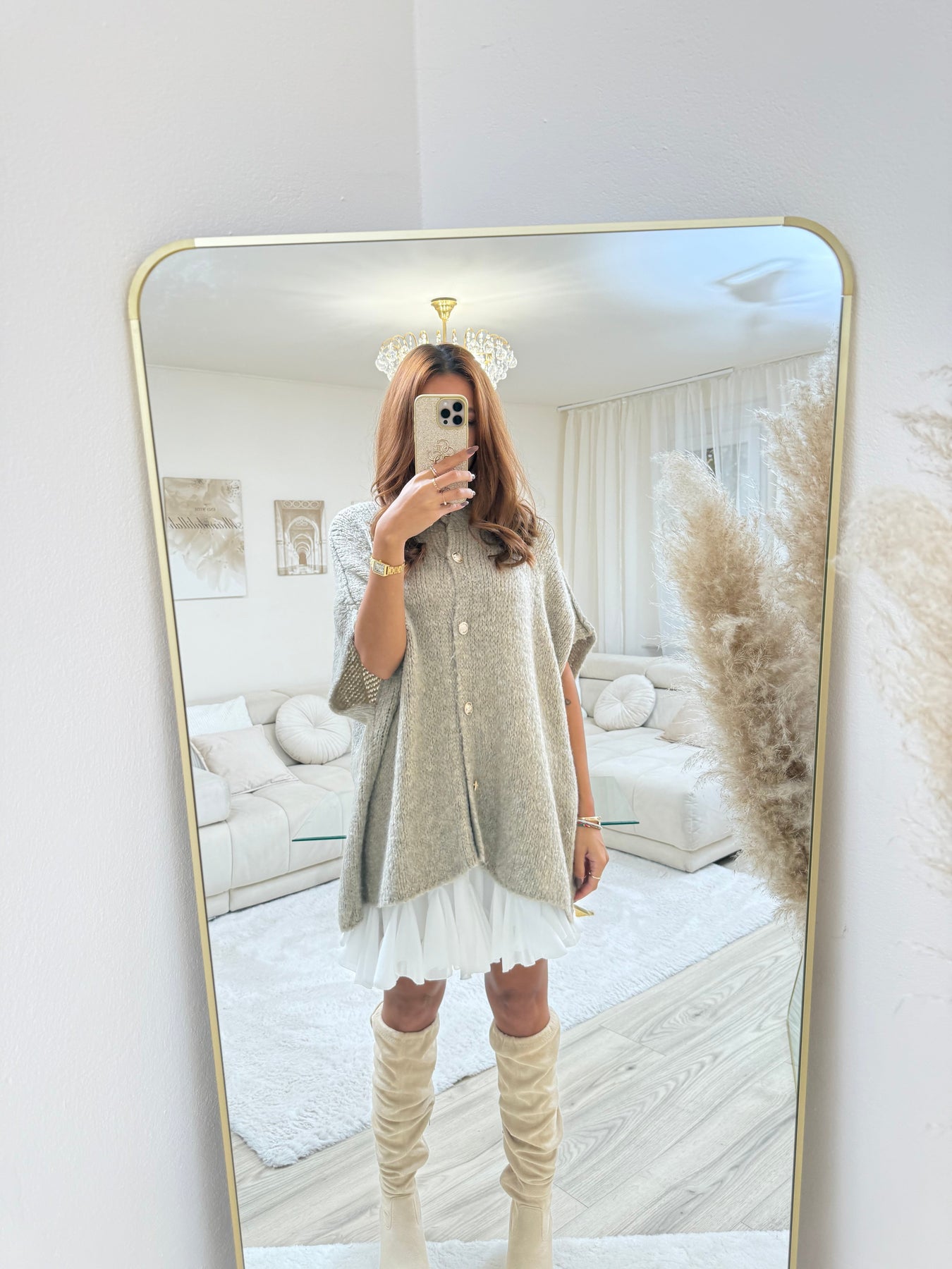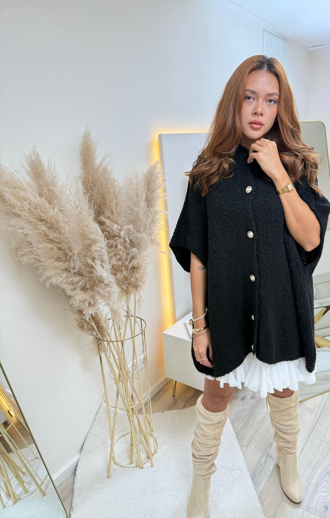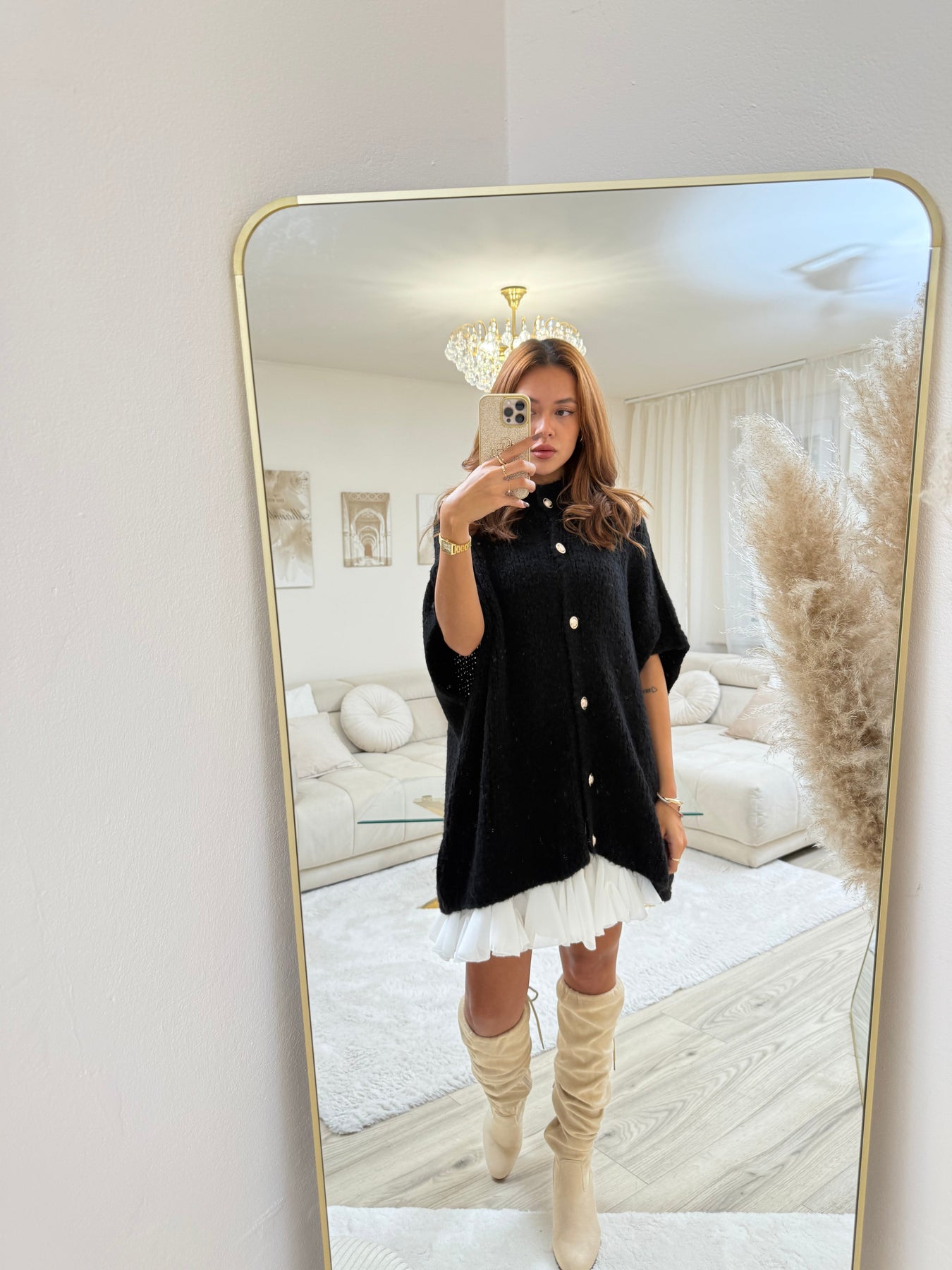 - Modernes Oversize-Design: Der lässige, oversized Schnitt und die kurzen Ärmel in Kombination mit goldfarbenen Knöpfen verleihen dem Strick-Pullunder einen einzigartigen, trendigen Look, der immer im Trend liegt.