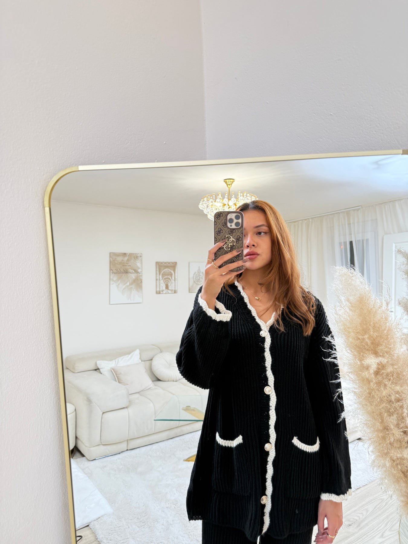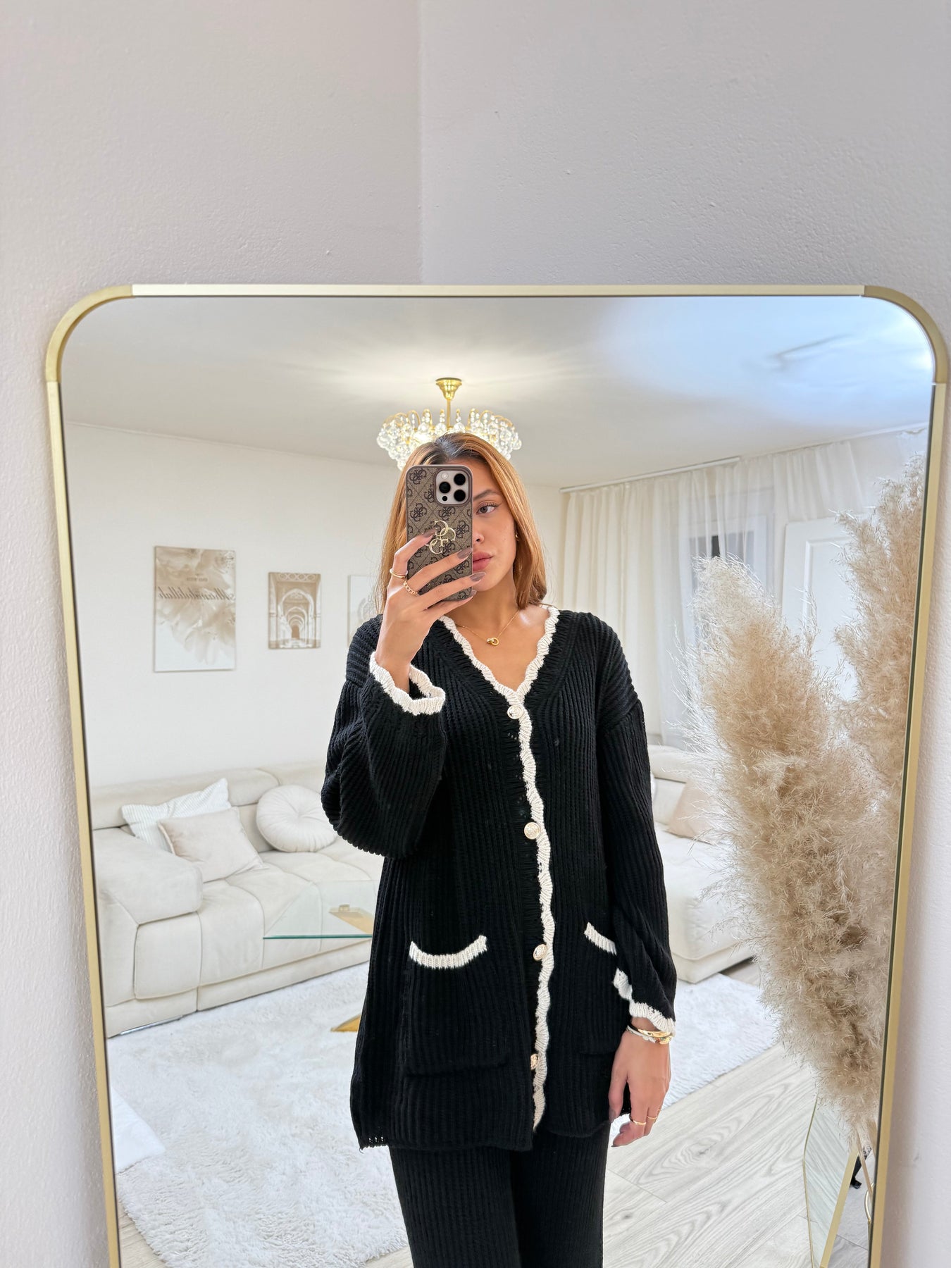 Mit seinen stilvollen goldenen Knöpfen, dem lässigen Oversize-Look und der hochwertigen Verarbeitung ist dieses Strick-Set ein absolutes Must-Have für jeden, der auch an frostigen Tagen nicht auf modische Eleganz verzichten möchte. Ob für entspannte Tage im Home-Office, gemütliche Stadtbummel oder festliche Anlässe – dieses Set bringt Wärme, Stil und pure Gemütlichkeit in deinen Alltag.