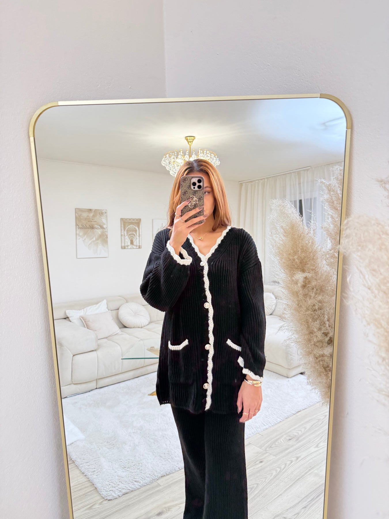 • Outfit-Idee: Style das Set mit High Heels oder schicken Stiefeletten und ergänze es mit einer eleganten Clutch. Der Cardigan verleiht dir einen weichen, aber dennoch schicken Look, der deine feminine Seite betont.