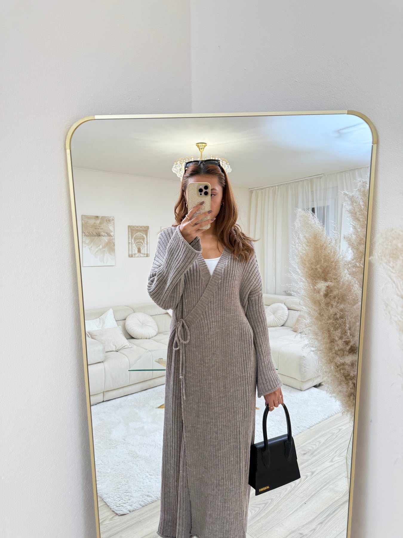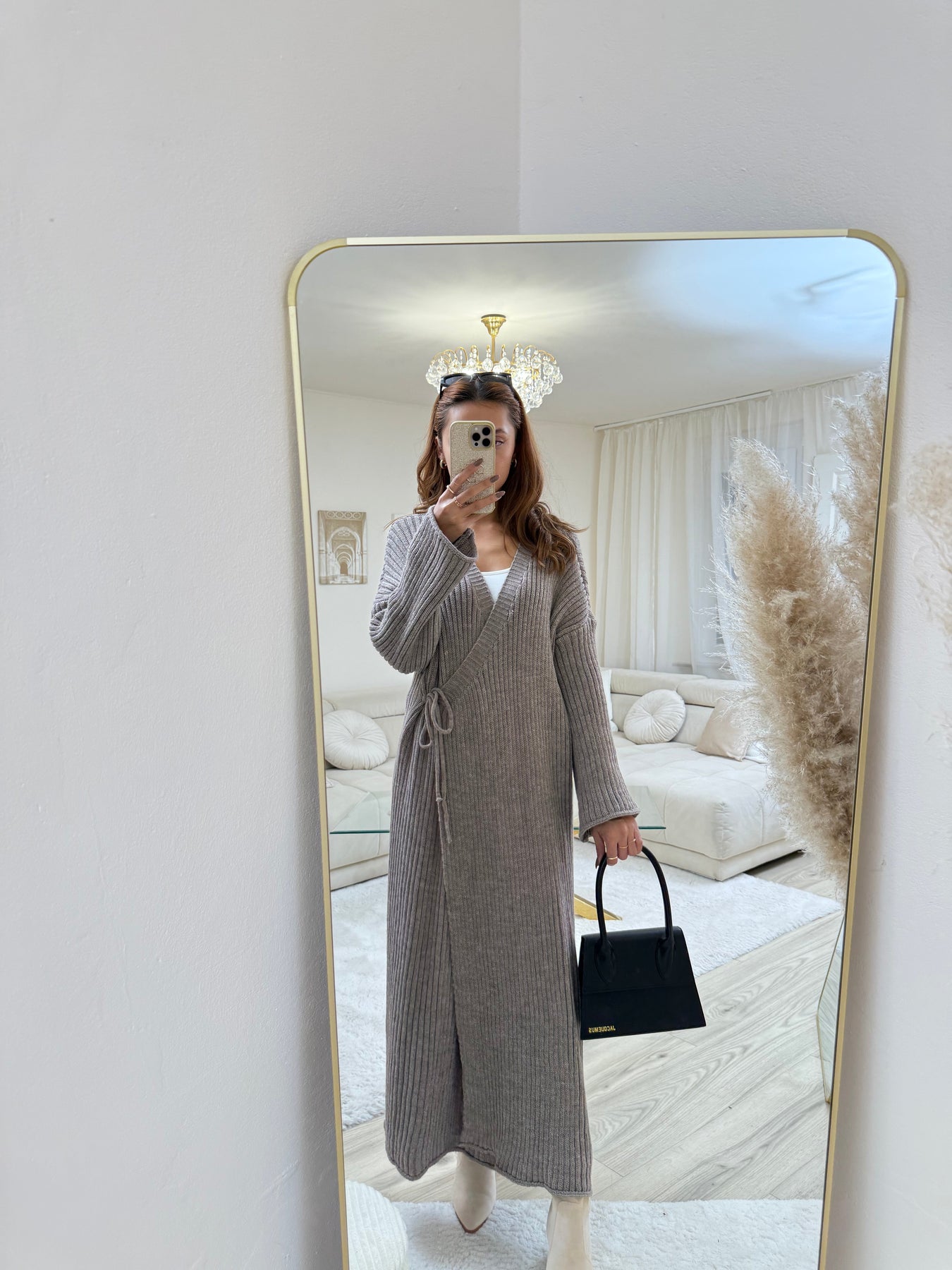 „Das Strickkleid ist mein absolutes Must-have für entspannte Wintertage. Es ist so bequem und der offene, wickelartige Schnitt sorgt für einen lässigen Look, den ich sowohl zu Hause als auch unterwegs trage. – Klara K.“
