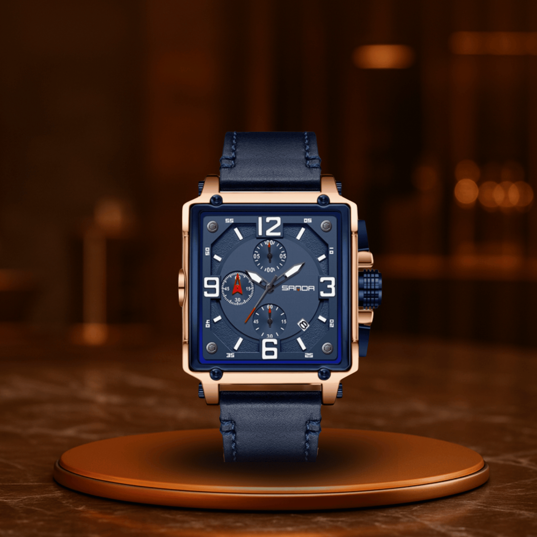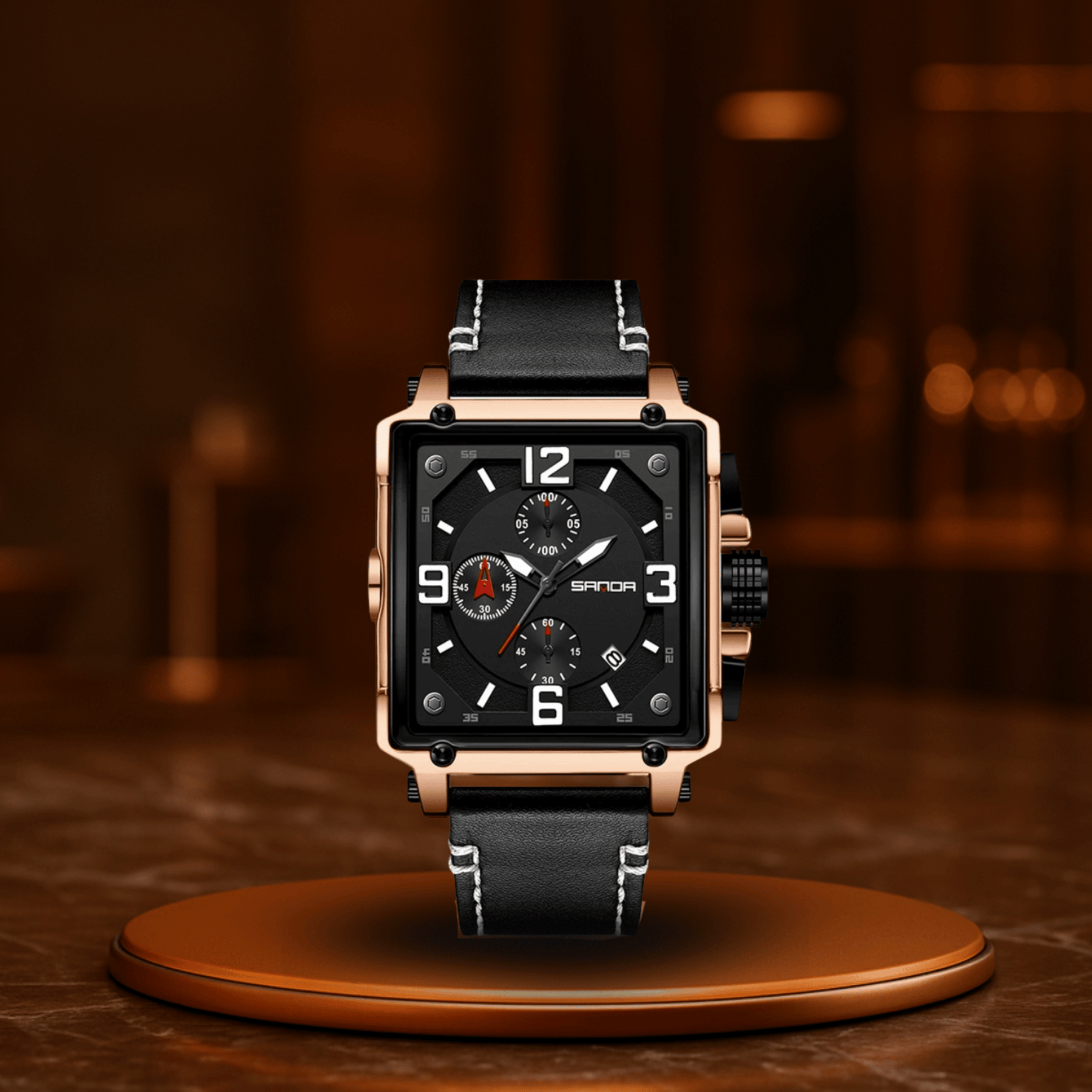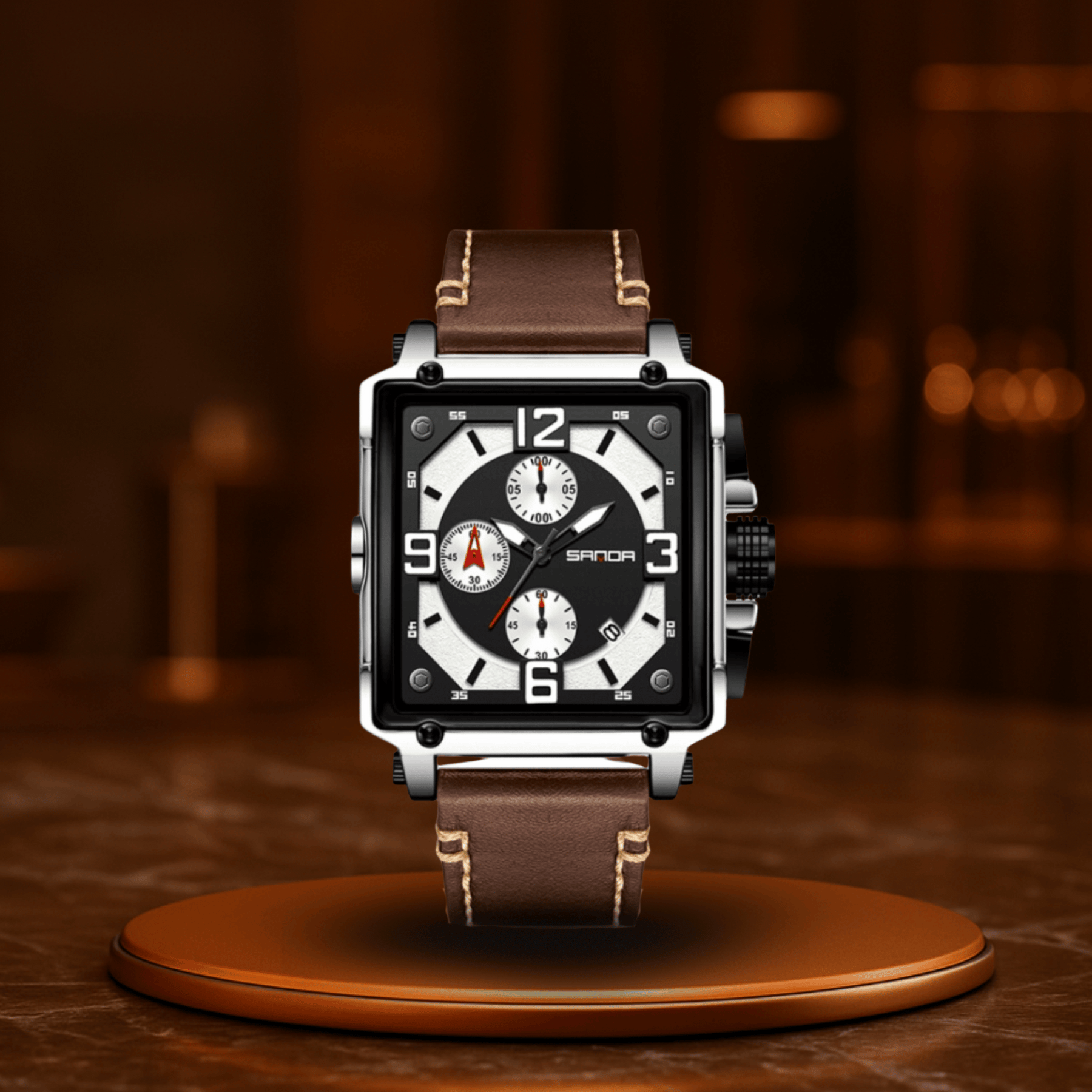 TacticalMaster ist mehr als nur eine Uhr – es ist eine Aussage an die Welt. Mit einem robusten Lederarmband im Army-Look und einem auffälligen, quadratischen Design sorgt diese Uhr dafür, dass du immer Präsenz zeigst, sowohl in der Natur als auch im Büro. Das präzise Quarzwerk garantiert höchste Zuverlässigkeit, während Schockbeständigkeit und Wasserdichtigkeit bis 3 ATM für den Mann gemacht sind, der keine Zeit mit Kompromissen verschwendet.