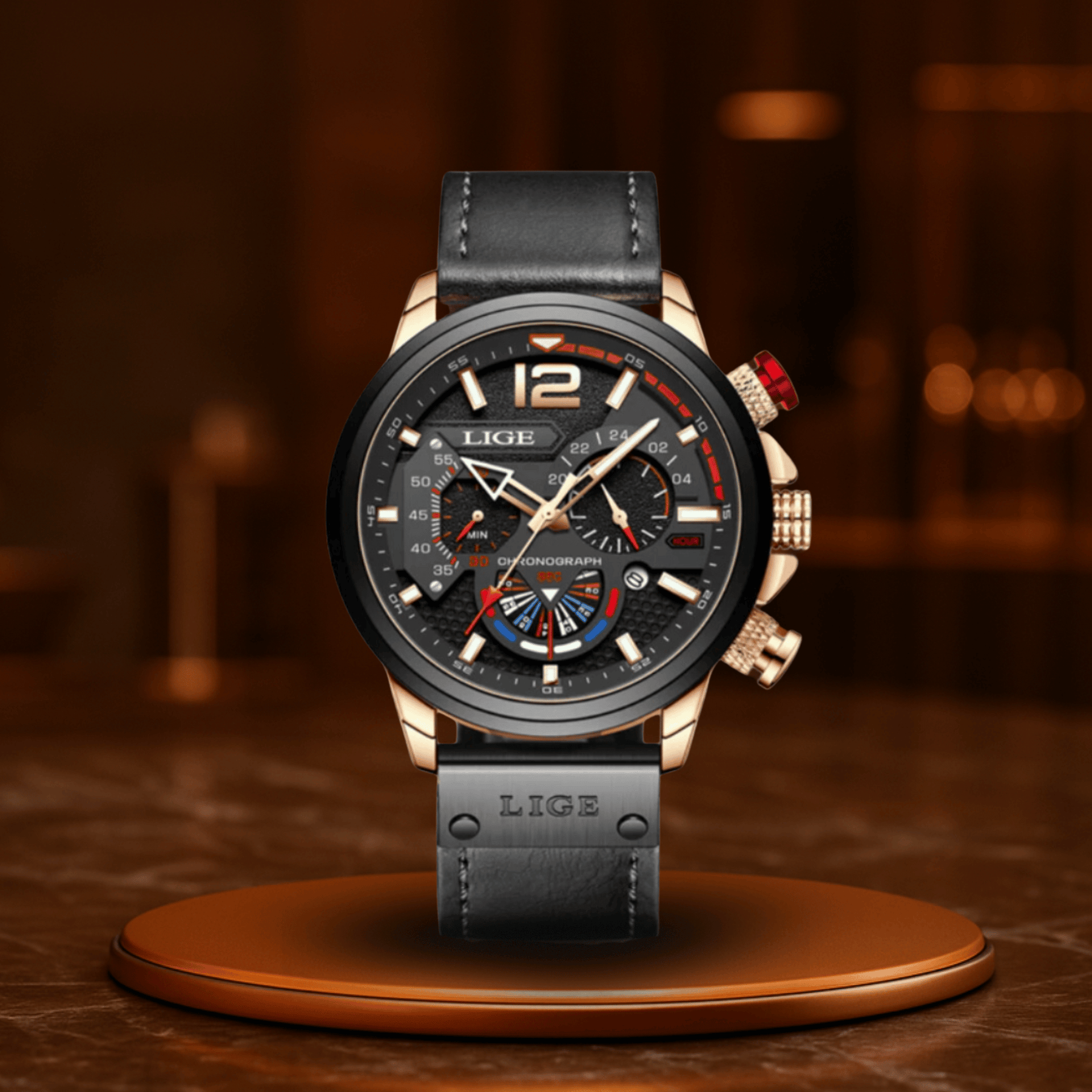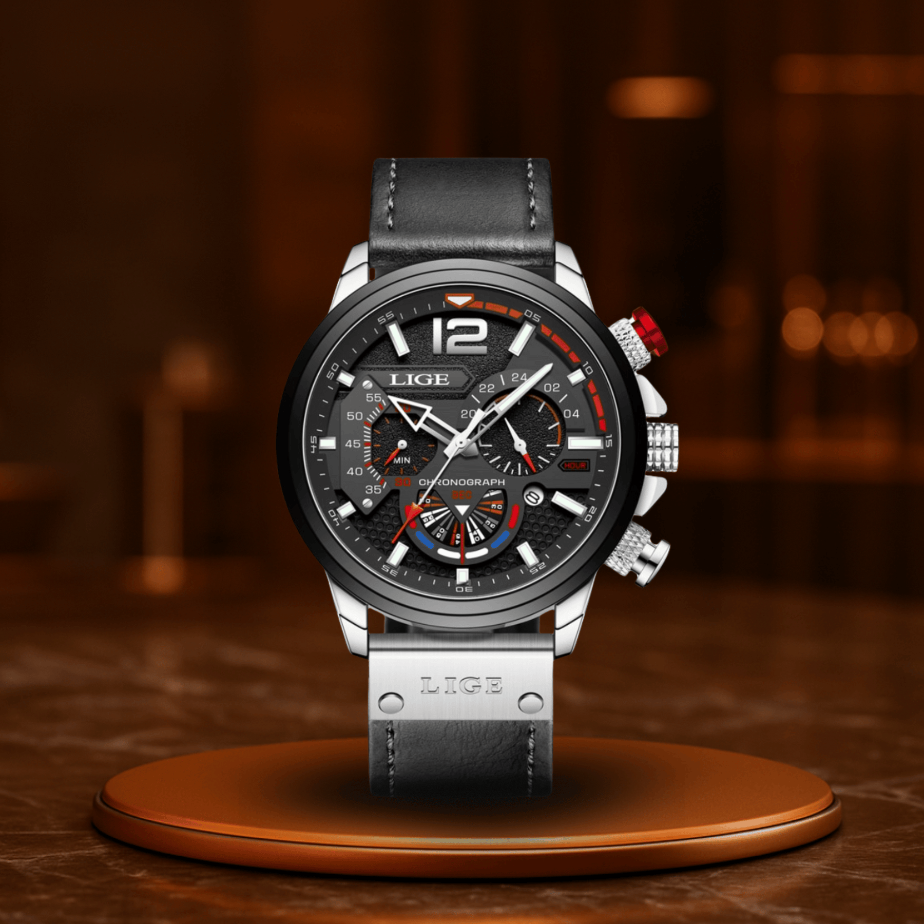 Vanguard Pro ist die perfekte Uhr für den Mann, der keine Grenzen kennt – und während eines anspruchsvollen Abenteuers keinen Komfortverlust akzeptiert. Mit einem präzisen Quarzwerk, einer auffälligen Chronographenanzeige und einer Datumsanzeige ist diese Uhr ebenso robust wie stilvoll. Das hochwertige Lederarmband garantiert nicht nur Komfort, sondern verleiht deinem Handgelenk auch eine elegante Ausstrahlung, während das wasserabweisende Design dafür sorgt, dass diese Uhr unter allen Bedingungen zuverlässig bleibt.